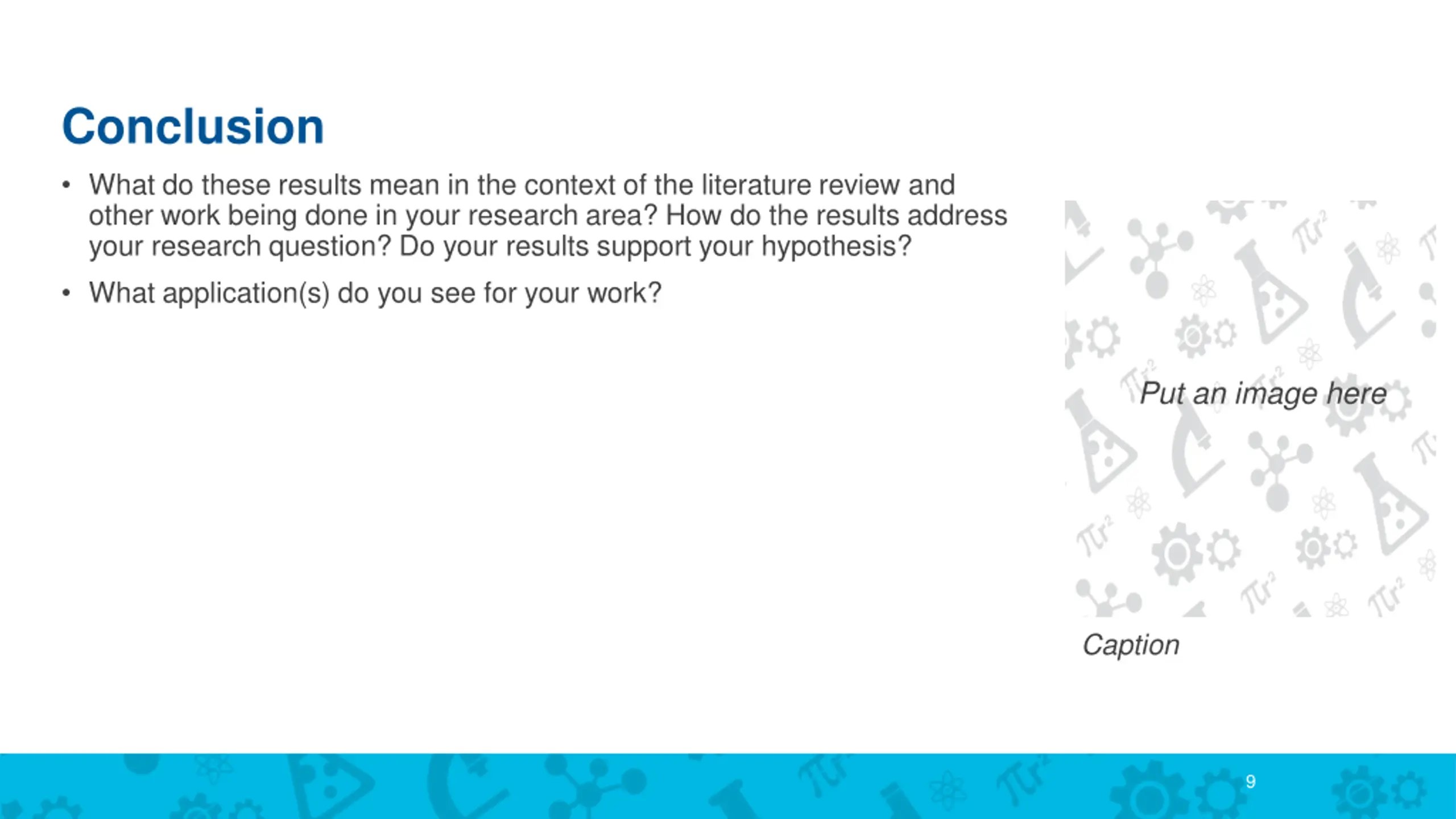 Conclusion What do these results mean in the context of the literature review and other work being done in your research area? How do the results address your research question? Do your results support your hypothesis? What application(s) do you see for your work? Put an image here Caption 9