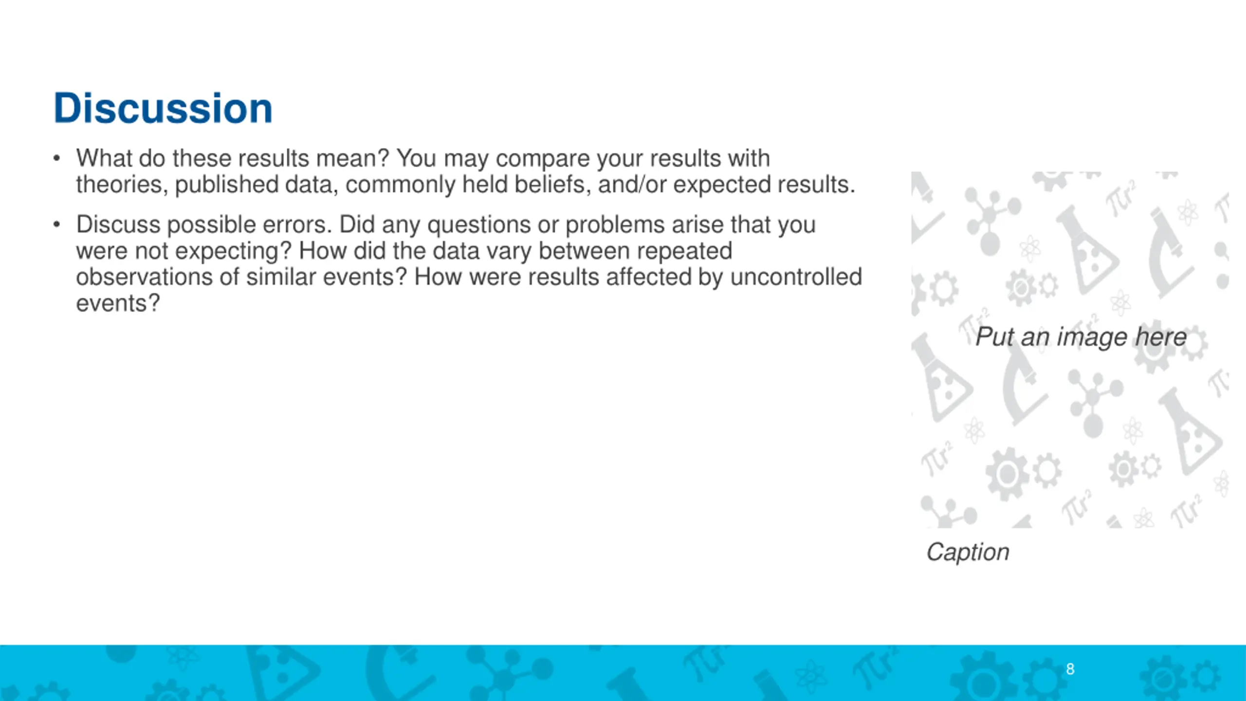 Discussion What do these results mean? You may compare your results with theories, published data, commonly held beliefs, and/or expected results. Discuss possible errors. Did any questions or problems arise that you were not expecting? How did the data vary between repeated observations of similar events? How were results affected by uncontrolled events? Put an image here Caption 8