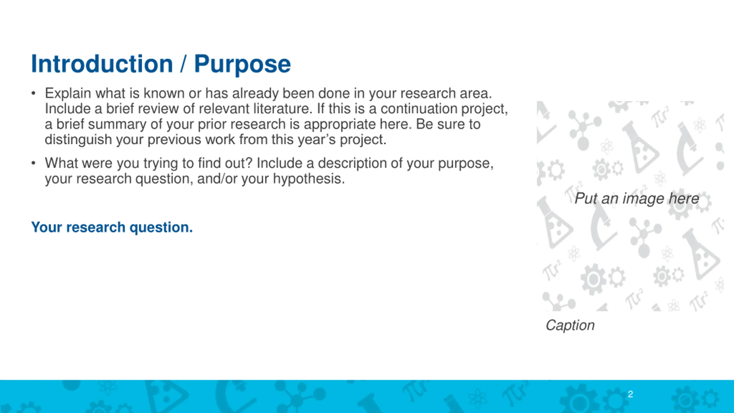 Introduction / Purpose Explain what is known or has already been done in your research area. Include a brief review of relevant literature. If this is a continuation project, a brief summary of your prior research is appropriate here. Be sure to distinguish your previous work from this year s project. What were you trying to find out? Include a description of your purpose, your research question, and/or your hypothesis. Put an image here Your research question. Caption 2