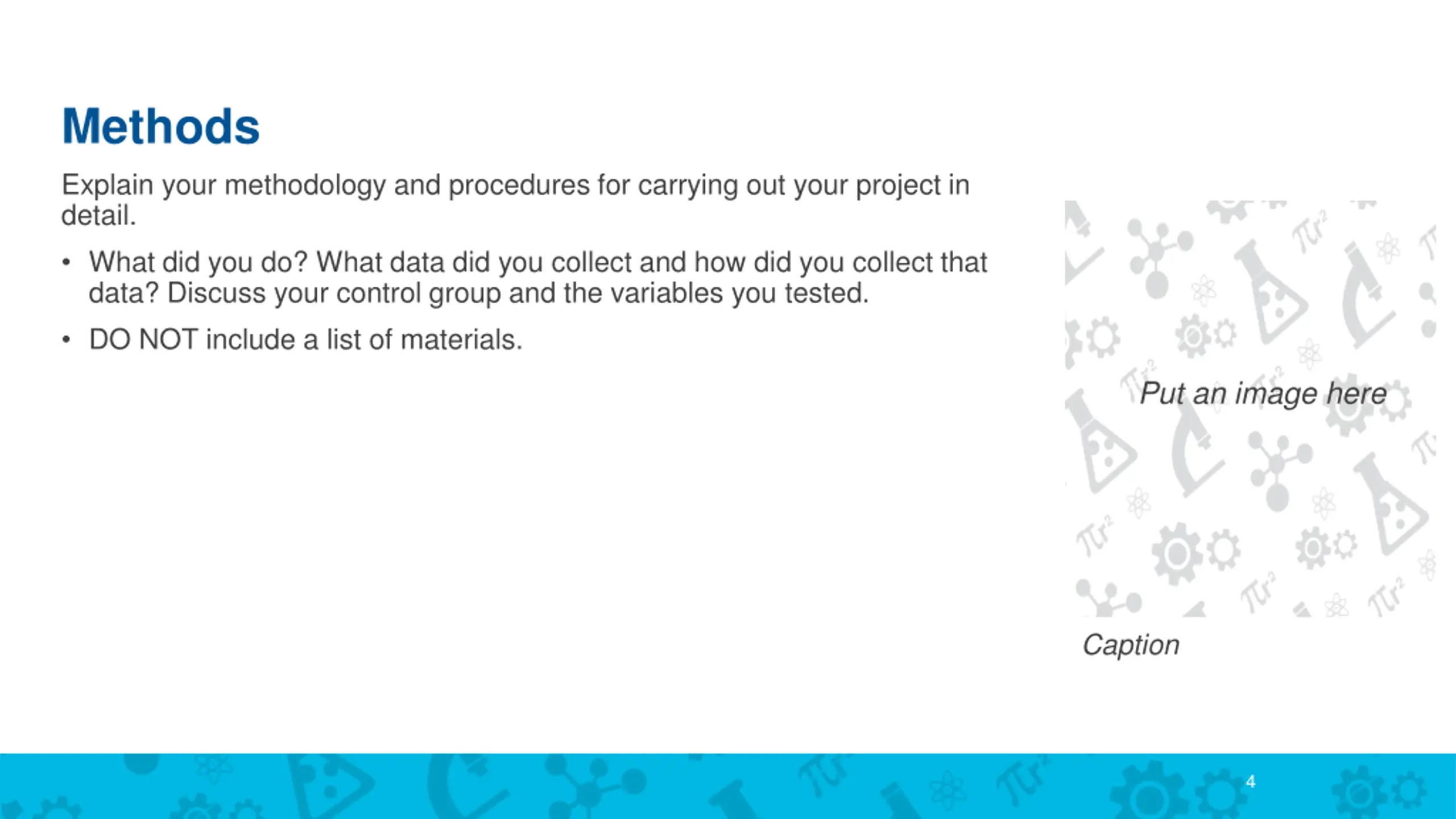 Methods Explain your methodology and procedures for carrying out your project in detail. What did you do? What data did you collect and how did you collect that data? Discuss your control group and the variables you tested. DO NOT include a list of materials. Put an image here Caption 4
