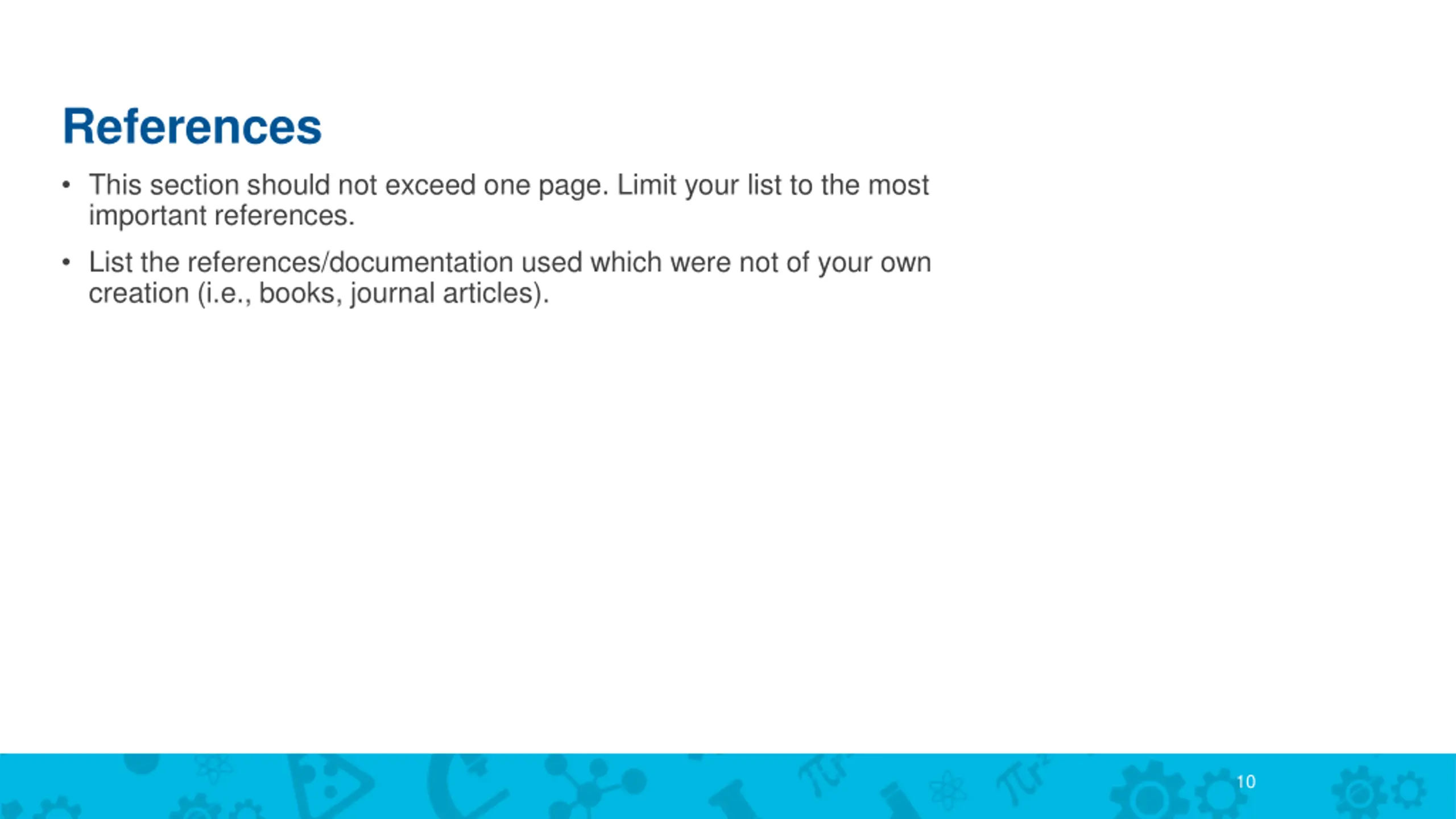 References This section should not exceed one page. Limit your list to the most important references. List the references/documentation used which were not of your own creation (i.e., books, journal articles). 10