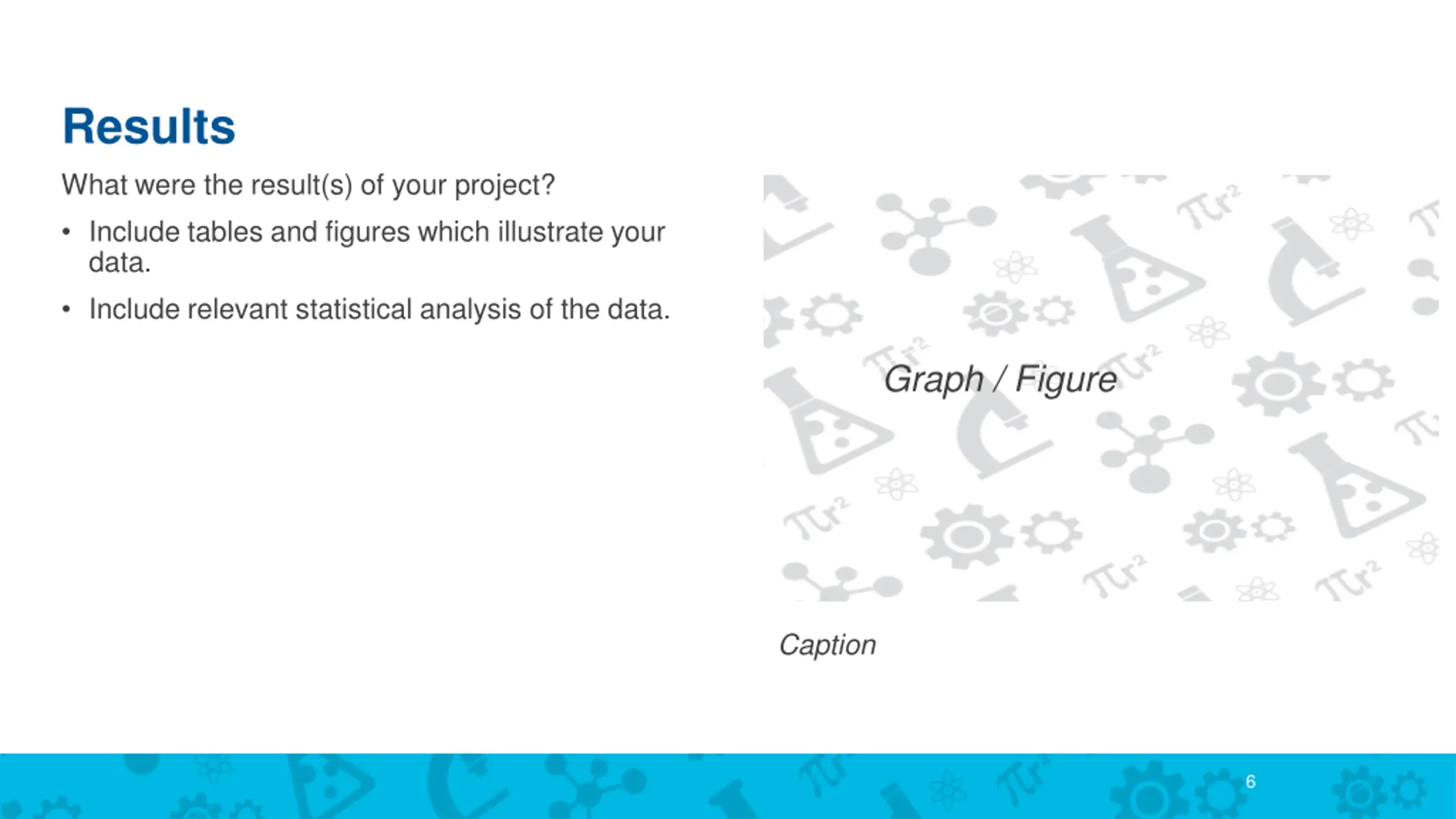Results What were the result(s) of your project? Include tables and figures which illustrate your data. Include relevant statistical analysis of the data. Graph / Figure Caption 6