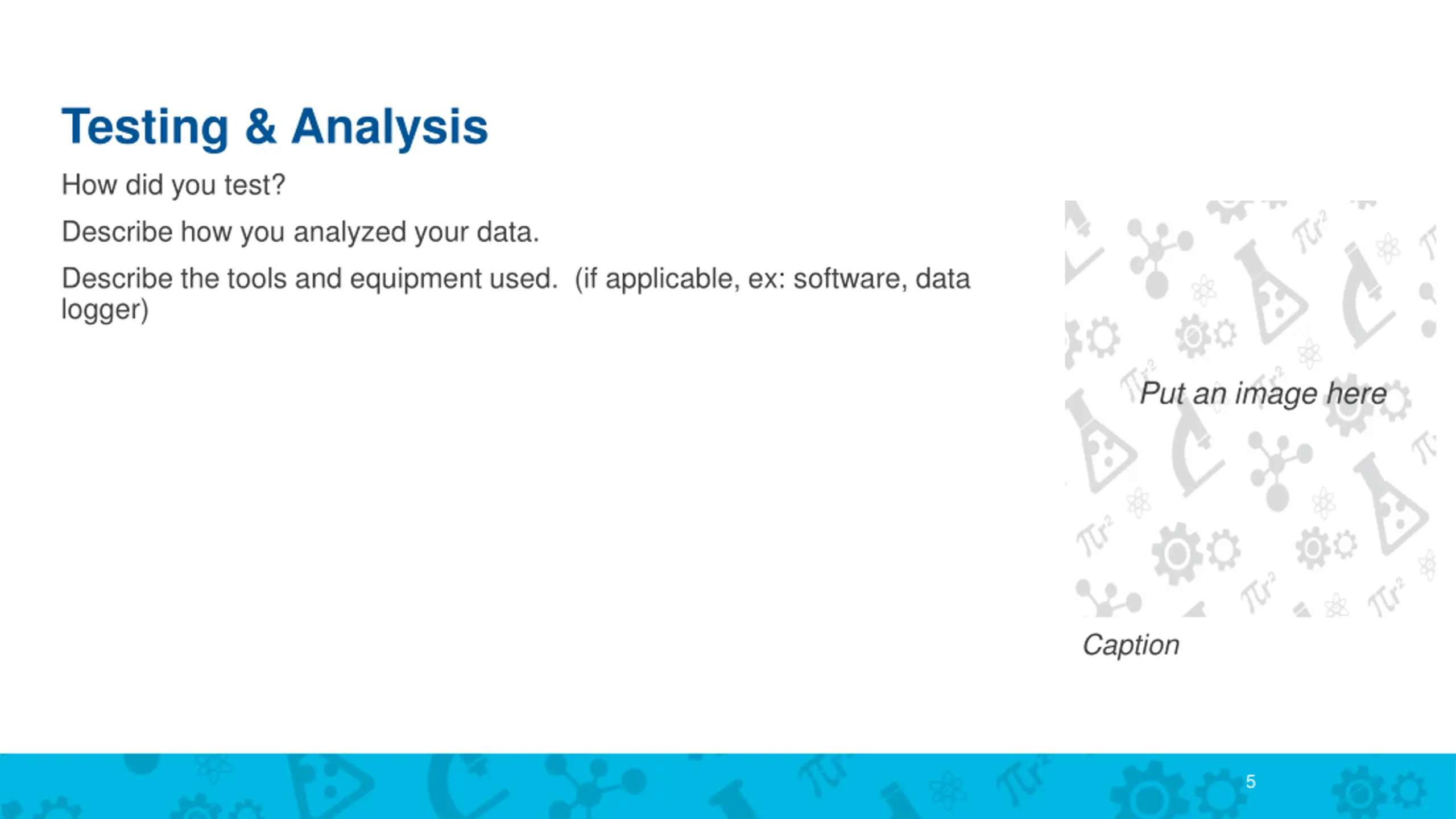 Testing & Analysis How did you test? Describe how you analyzed your data. Describe the tools and equipment used. (if applicable, ex: software, data logger) Put an image here Caption 5