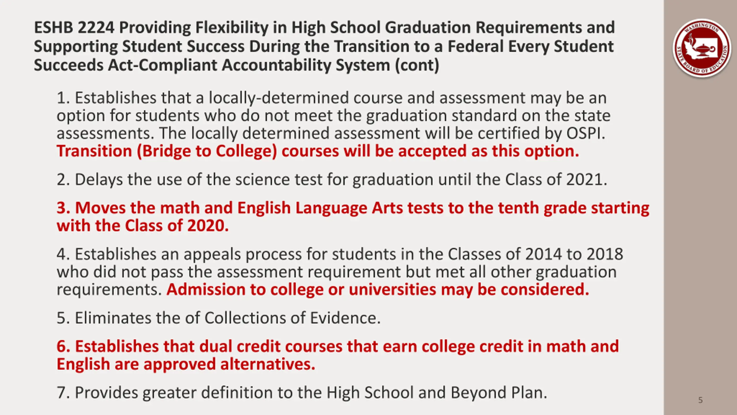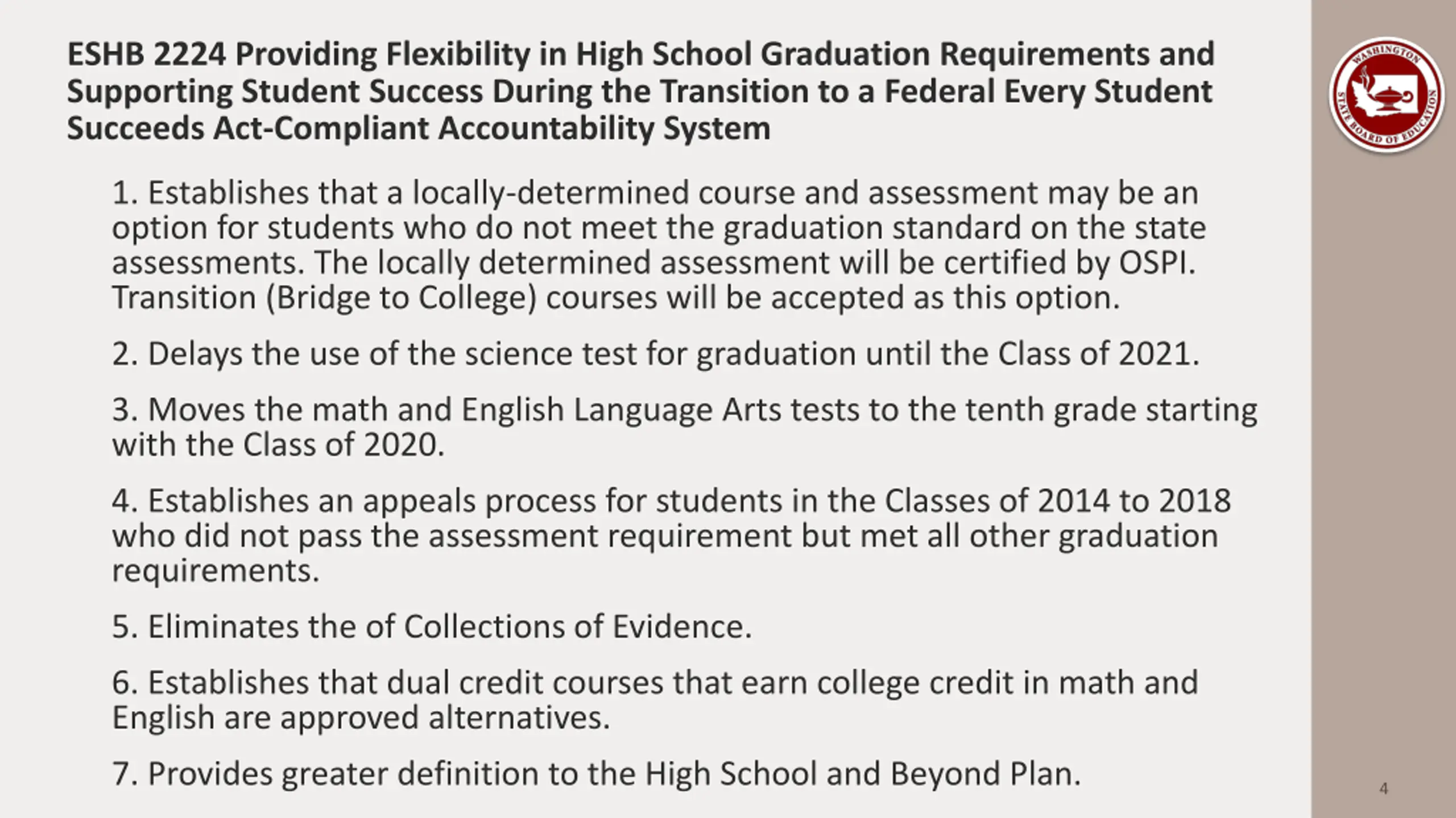 ESHB 2224 Providing Flexibility in High School Graduation Requirements and Supporting Student Success During the Transition to a Federal Every Student Succeeds Act-Compliant Accountability System 1. Establishes that a locally-determined course and assessment may be an option for students who do not meet the graduation standard on the state assessments. The locally determined assessment will be certified by OSPI. Transition (Bridge to College) courses will be accepted as this option. 2. Delays the use of the science test for graduation until the Class of 2021. 3. Moves the math and English Language Arts tests to the tenth grade starting with the Class of 2020. 4. Establishes an appeals process for students in the Classes of 2014 to 2018 who did not pass the assessment requirement but met all other graduation requirements. 5. Eliminates the of Collections of Evidence. 6. Establishes that dual credit courses that earn college credit in math and English are approved alternatives. 7. Provides greater definition to the High School and Beyond Plan. 4