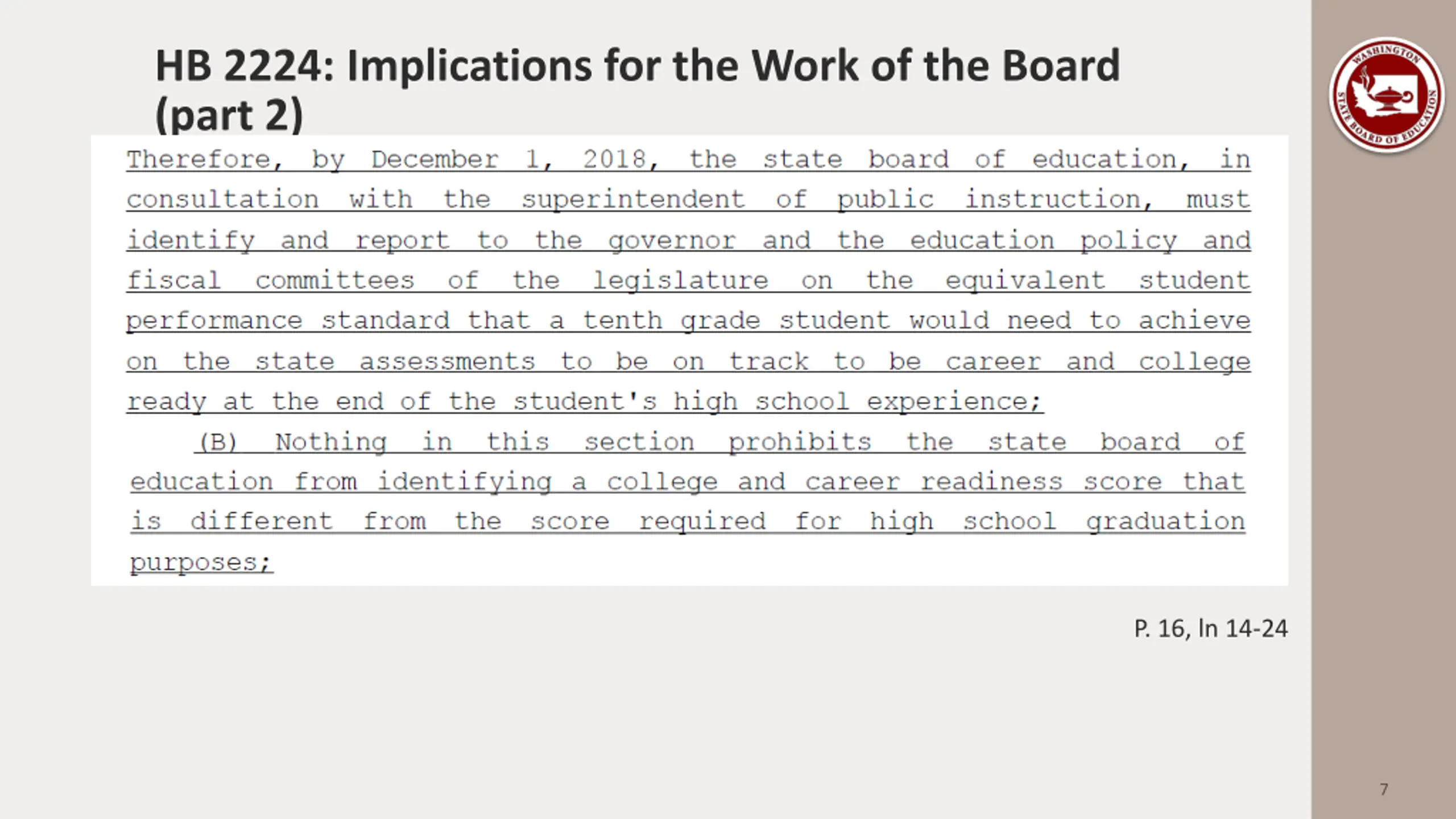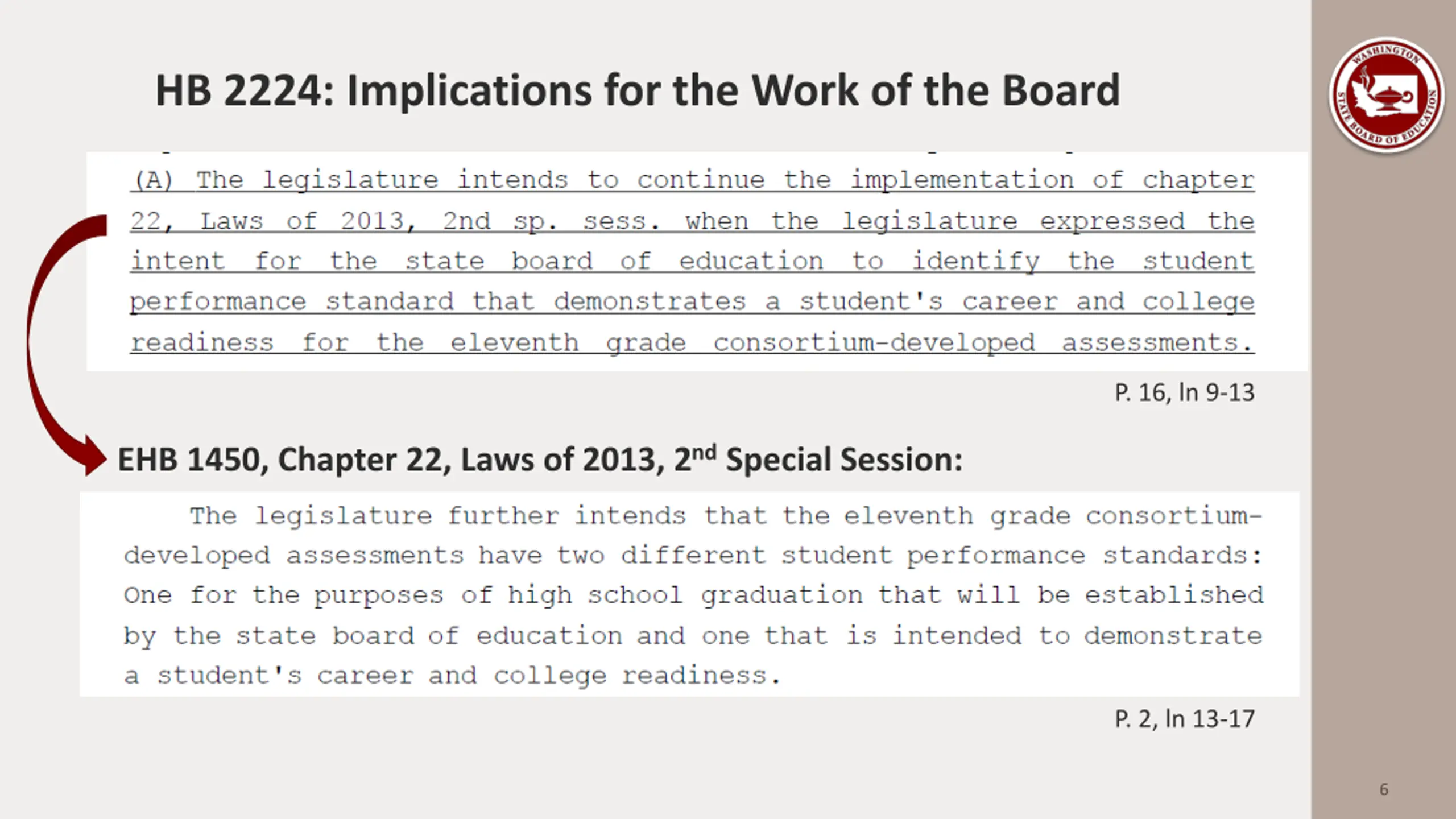 HB 2224: Implications for the Work of the Board P. 16, ln 9-13 EHB 1450, Chapter 22, Laws of 2013, 2nd Special Session: P. 2, ln 13-17 6