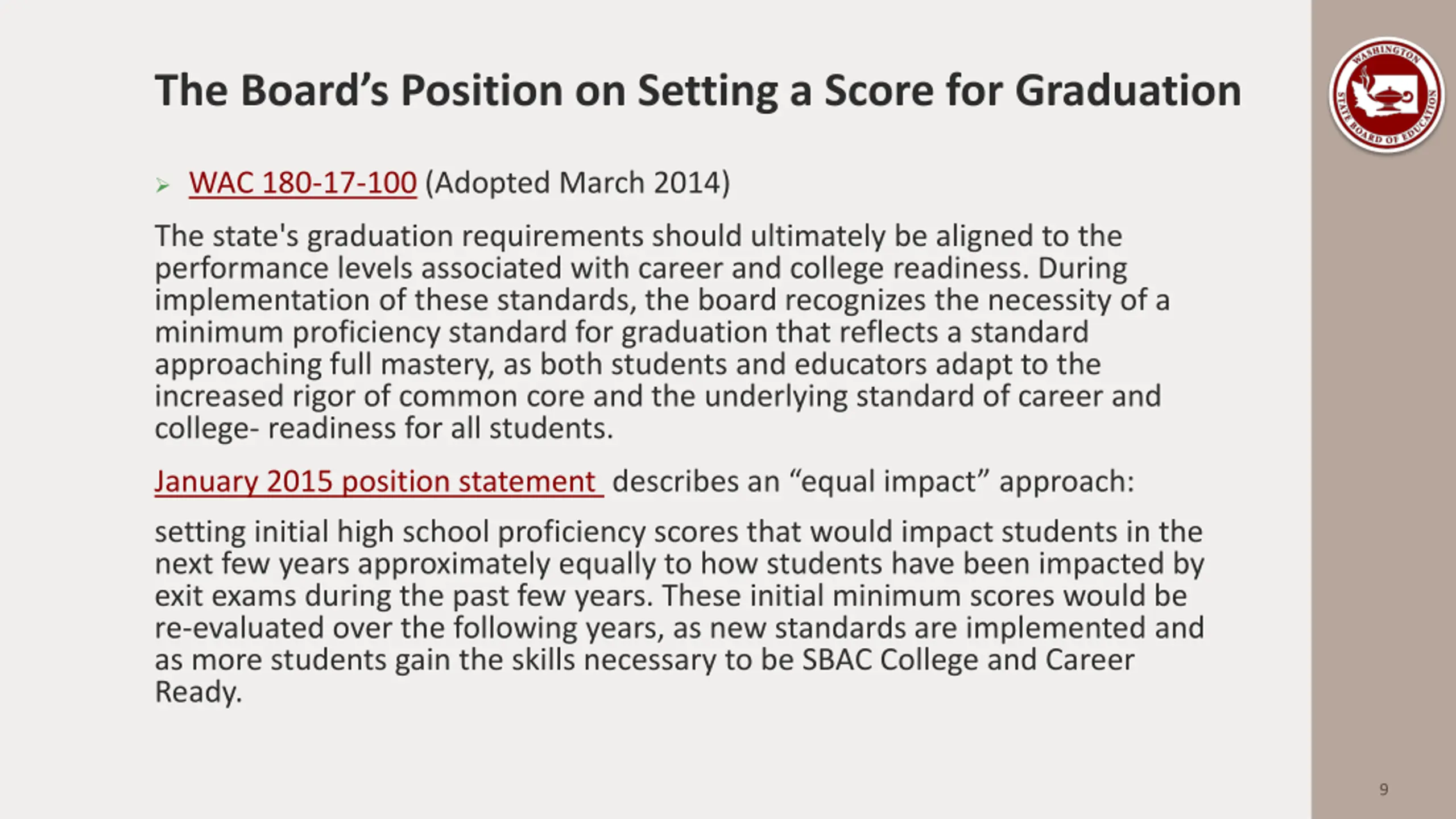 The Boards Position on Setting a Score for Graduation WAC 180-17-100 (Adopted March 2014) The state's graduation requirements should ultimately be aligned to the performance levels associated with career and college readiness. During implementation of these standards, the board recognizes the necessity of a minimum proficiency standard for graduation that reflects a standard approaching full mastery, as both students and educators adapt to the increased rigor of common core and the underlying standard of career and college- readiness for all students. January 2015 position statement describes an equal impact approach: setting initial high school proficiency scores that would impact students in the next few years approximately equally to how students have been impacted by exit exams during the past few years. These initial minimum scores would be re-evaluated over the following years, as new standards are implemented and as more students gain the skills necessary to be SBAC College and Career Ready. 9