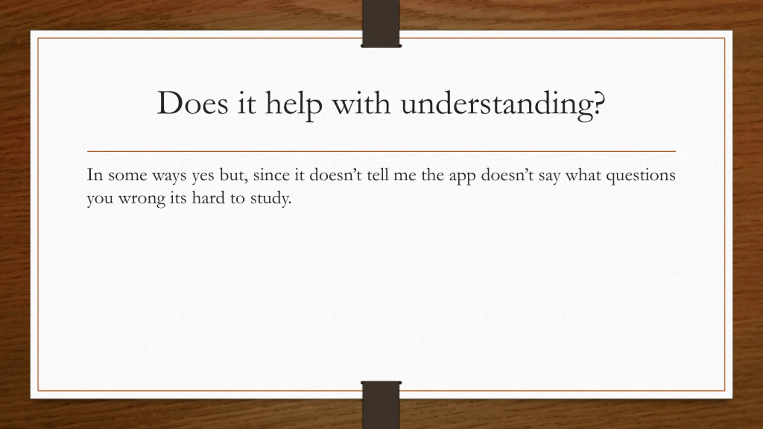 Does it help with understanding? In some ways yes but, since it doesn t tell me the app doesn t say what questions you wrong its hard to study.