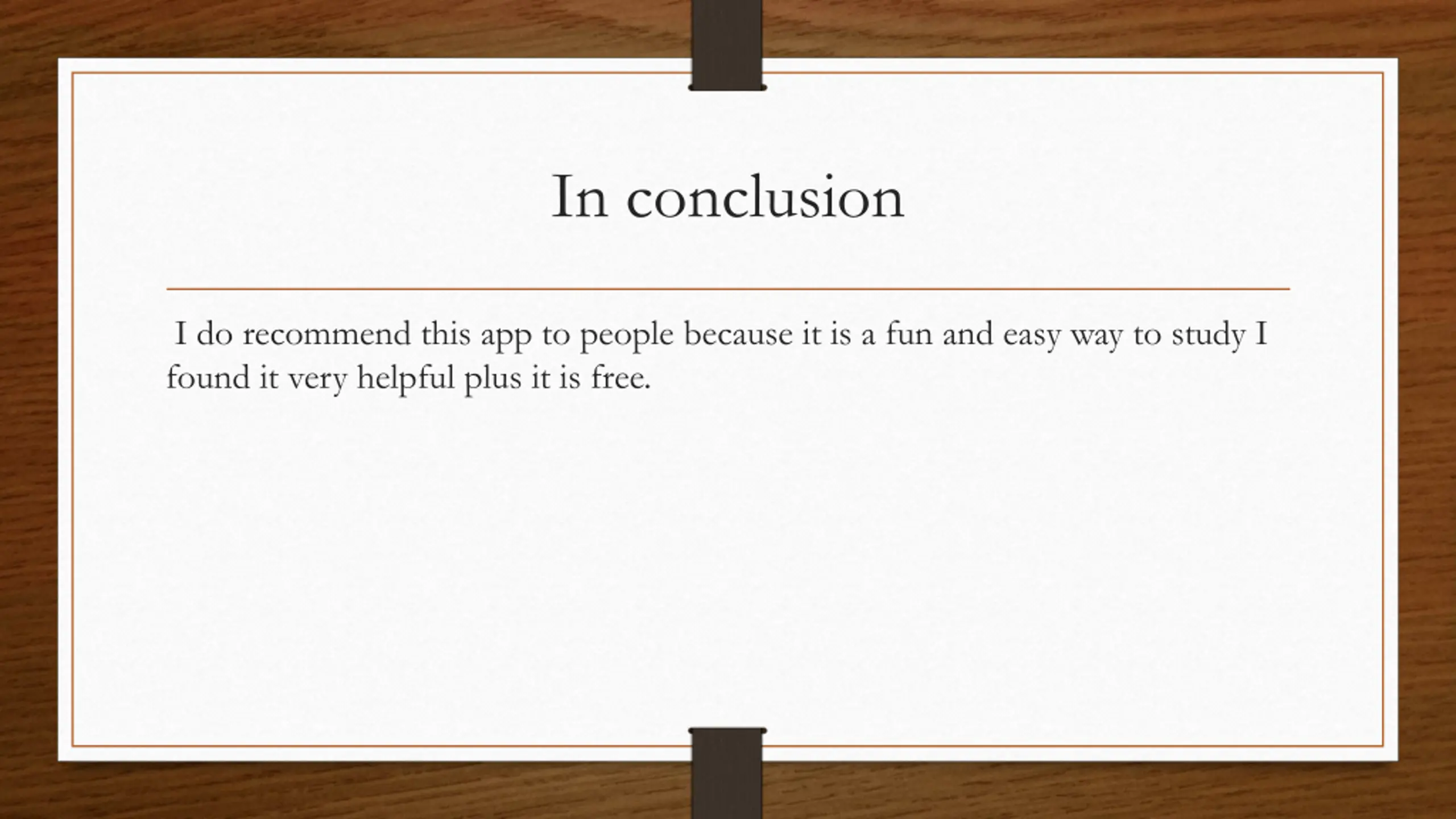 In conclusion I do recommend this app to people because it is a fun and easy way to study I found it very helpful plus it is free.