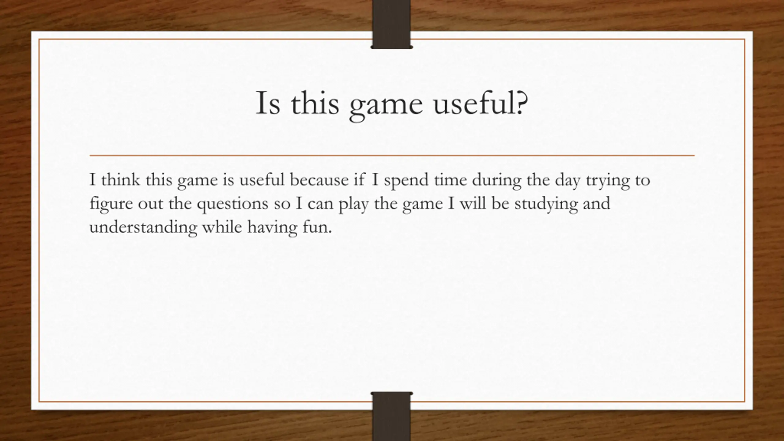 Is this game useful? I think this game is useful because if I spend time during the day trying to figure out the questions so I can play the game I will be studying and understanding while having fun.