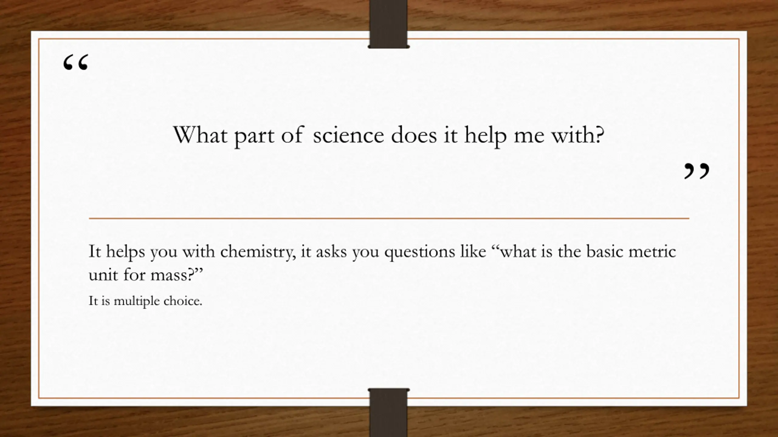What part of science does it help me with? It helps you with chemistry, it asks you questions like what is the basic metric unit for mass? It is multiple choice.