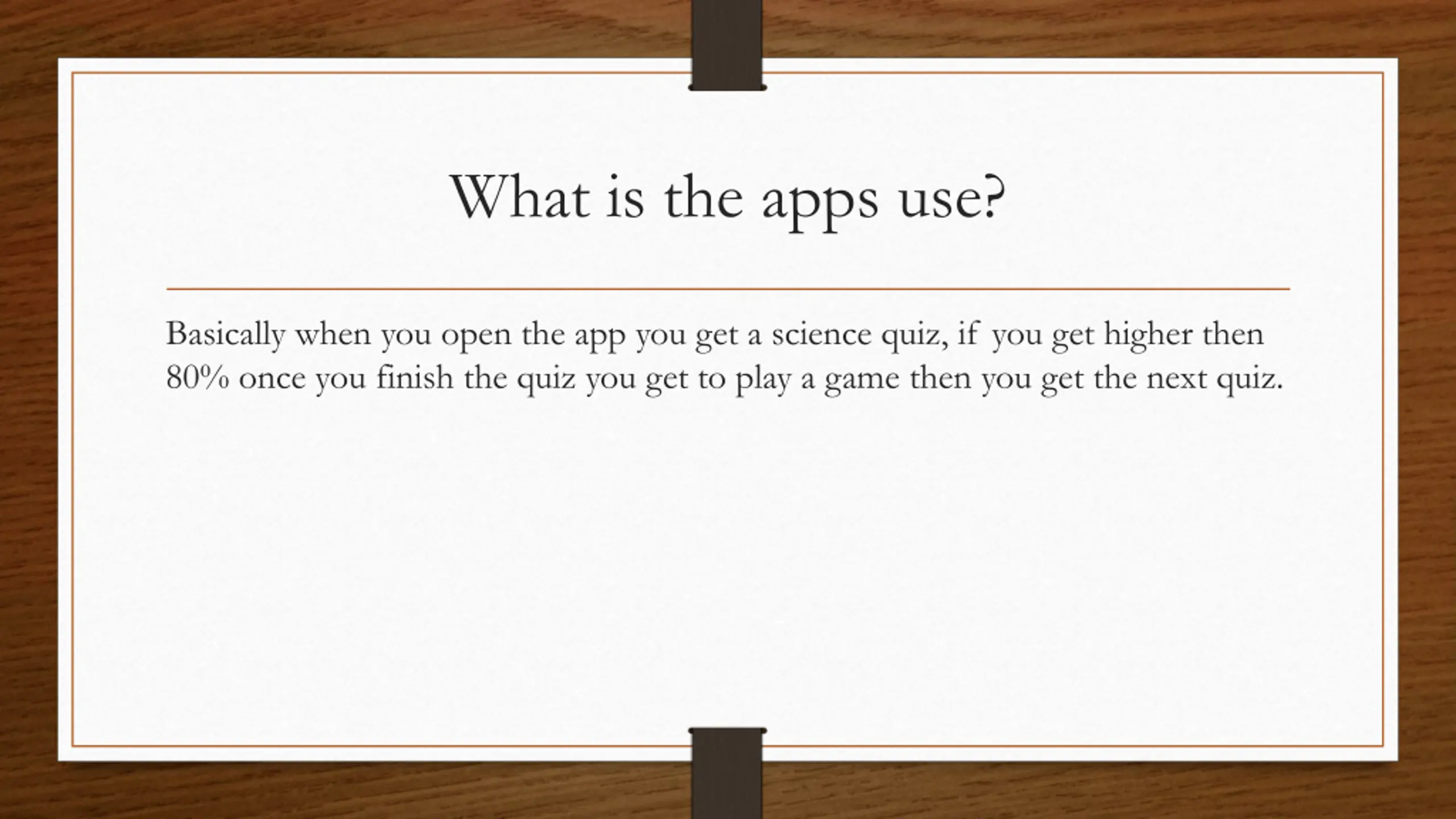 What is the apps use? Basically when you open the app you get a science quiz, if you get higher then 80% once you finish the quiz you get to play a game then you get the next quiz.