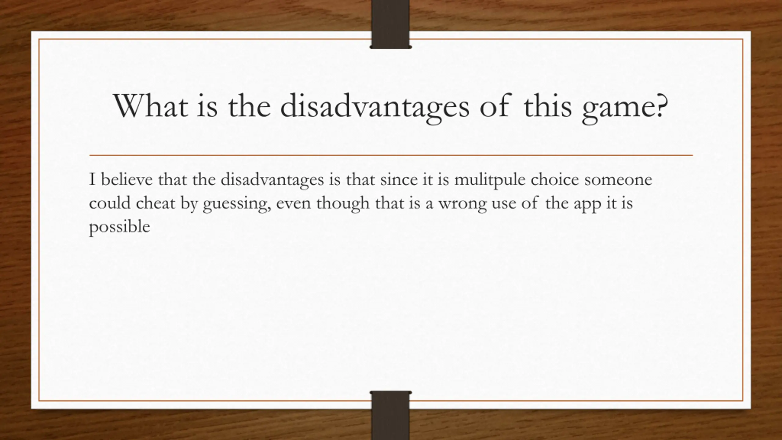 What is the disadvantages of this game? I believe that the disadvantages is that since it is mulitpule choice someone could cheat by guessing, even though that is a wrong use of the app it is possible