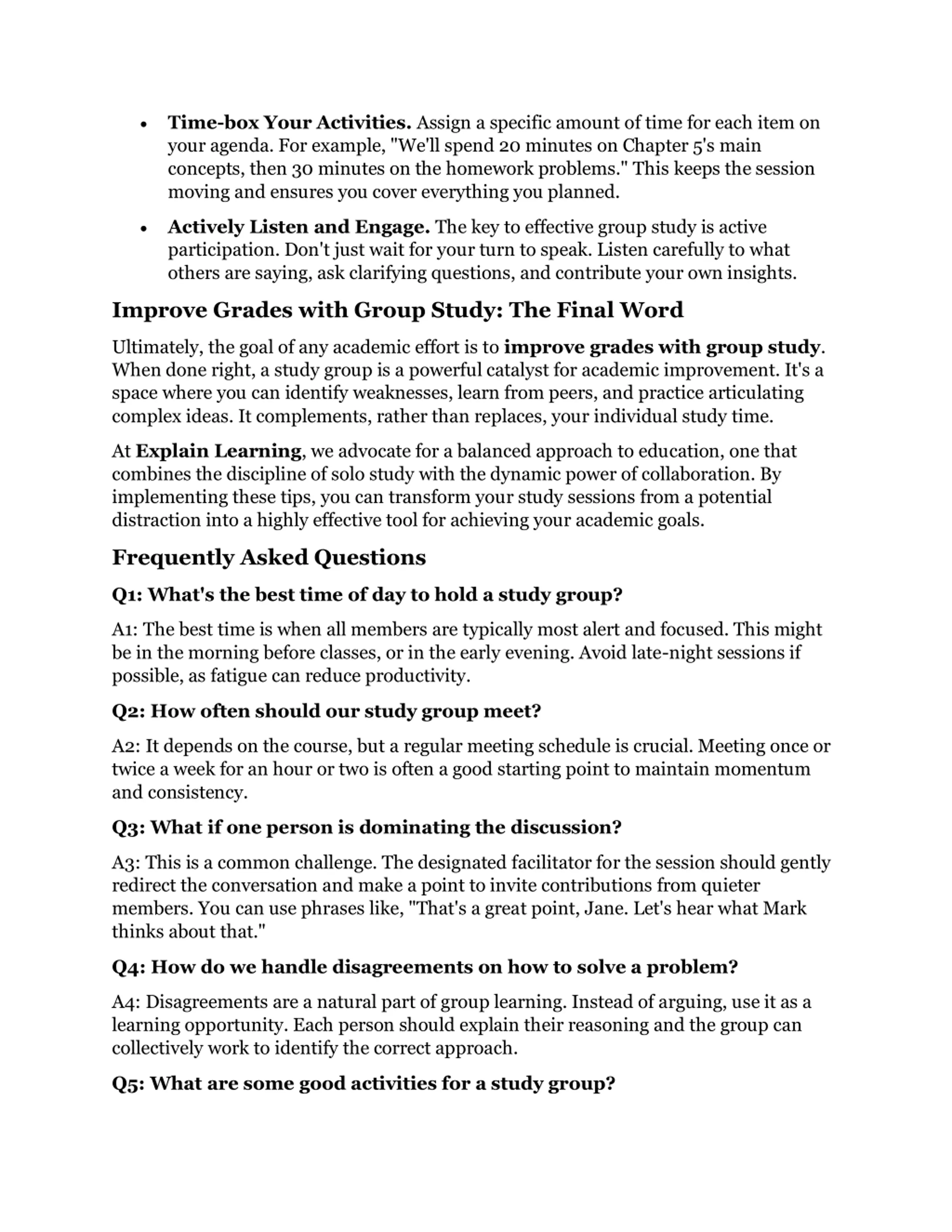 Time-box Your Activities. Assign a specific amount of time for each item on your agenda. For example, "We'll spend 20 minutes on Chapter 5's main concepts, then 30 minutes on the homework problems." This keeps the session moving and ensures you cover everything you planned. Actively Listen and Engage. The key to effective group study is active participation. Don't just wait for your turn to speak. Listen carefully to what others are saying, ask clarifying questions, and contribute your own insights. Improve Grades with Group Study: The Final Word Ultimately, the goal of any academic effort is to improve grades with group study. When done right, a study group is a powerful catalyst for academic improvement. It's a space where you can identify weaknesses, learn from peers, and practice articulating complex ideas. It complements, rather than replaces, your individual study time. At Explain Learning, we advocate for a balanced approach to education, one that combines the discipline of solo study with the dynamic power of collaboration. By implementing these tips, you can transform your study sessions from a potential distraction into a highly effective tool for achieving your academic goals. Frequently Asked Questions Q1: What's the best time of day to hold a study group? A1: The best time is when all members are typically most alert and focused. This might be in the morning before classes, or in the early evening. Avoid late-night sessions if possible, as fatigue can reduce productivity. Q2: How often should our study group meet? A2: It depends on the course, but a regular meeting schedule is crucial. Meeting once or twice a week for an hour or two is often a good starting point to maintain momentum and consistency. Q3: What if one person is dominating the discussion? A3: This is a common challenge. The designated facilitator for the session should gently redirect the conversation and make a point to invite contributions from quieter members. You can use phrases like, "That's a great point, Jane. Let's hear what Mark thinks about that." Q4: How do we handle disagreements on how to solve a problem? A4: Disagreements are a natural part of group learning. Instead of arguing, use it as a learning opportunity. Each person should explain their reasoning and the group can collectively work to identify the correct approach. Q5: What are some good activities for a study group?