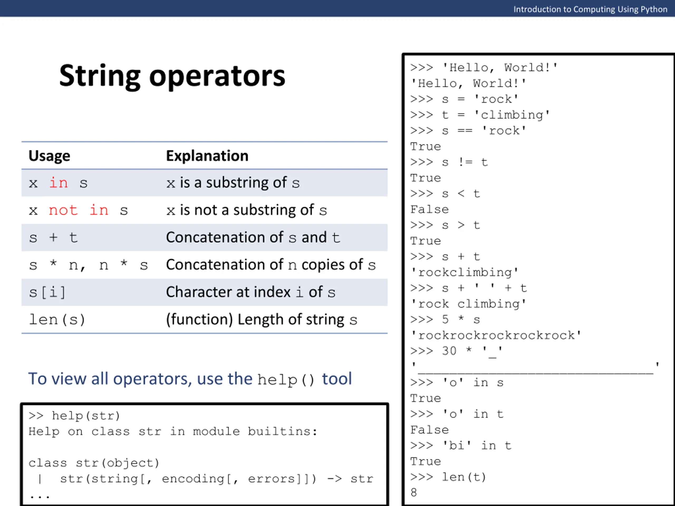 Introduction to Computing Using Python >>> 'Hello, World!' 'Hello, World!' >>> s = 'rock' >>> t = 'climbing' >>> s == 'rock' True >>> s != t True >>> s < t False >>> s > t True >>> s + t 'rockclimbing' >>> s + ' ' + t 'rock climbing' >>> 5 * s 'rockrockrockrockrock' >>> 30 * '_' '______________________________' >>> 'o' in s True >>> 'o' in t False >>> 'bi' in t True >>> len(t) 8 String operators Usage x in s x not in s s + t s * n, n * s s[i] len(s) Explanation x is a substring of s x is not a substring of s Concatenation of s and t Concatenation of n copies of s Character at index i of s (function) Length of string s To view all operators, use the help() tool >> help(str) Help on class str in module builtins: class str(object) | str(string[, encoding[, errors]]) -> str ...