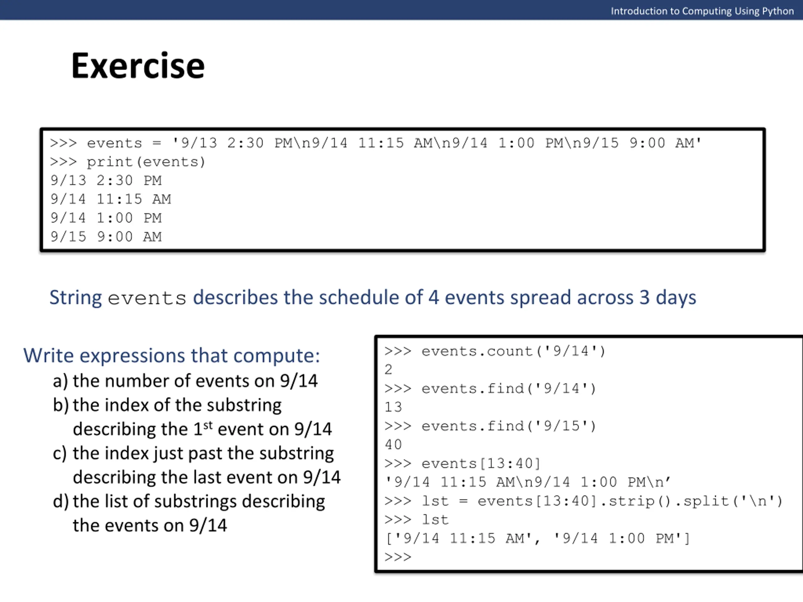 Introduction to Computing Using Python Exercise >>> events = '9/13 2:30 PM\n9/14 11:15 AM\n9/14 1:00 PM\n9/15 9:00 AM' >>> print(events) 9/13 2:30 PM 9/14 11:15 AM 9/14 1:00 PM 9/15 9:00 AM String events describes the schedule of 4 events spread across 3 days >>> events.count('9/14') 2 >>> events.find('9/14') 13 >>> events.find('9/15') 40 >>> events[13:40] '9/14 11:15 AM\n9/14 1:00 PM\n >>> lst = events[13:40].strip().split('\n') >>> lst ['9/14 11:15 AM', '9/14 1:00 PM'] >>> Write expressions that compute: a) the number of events on 9/14 b)the index of the substring describing the 1st event on 9/14 c) the index just past the substring describing the last event on 9/14 d)the list of substrings describing the events on 9/14
