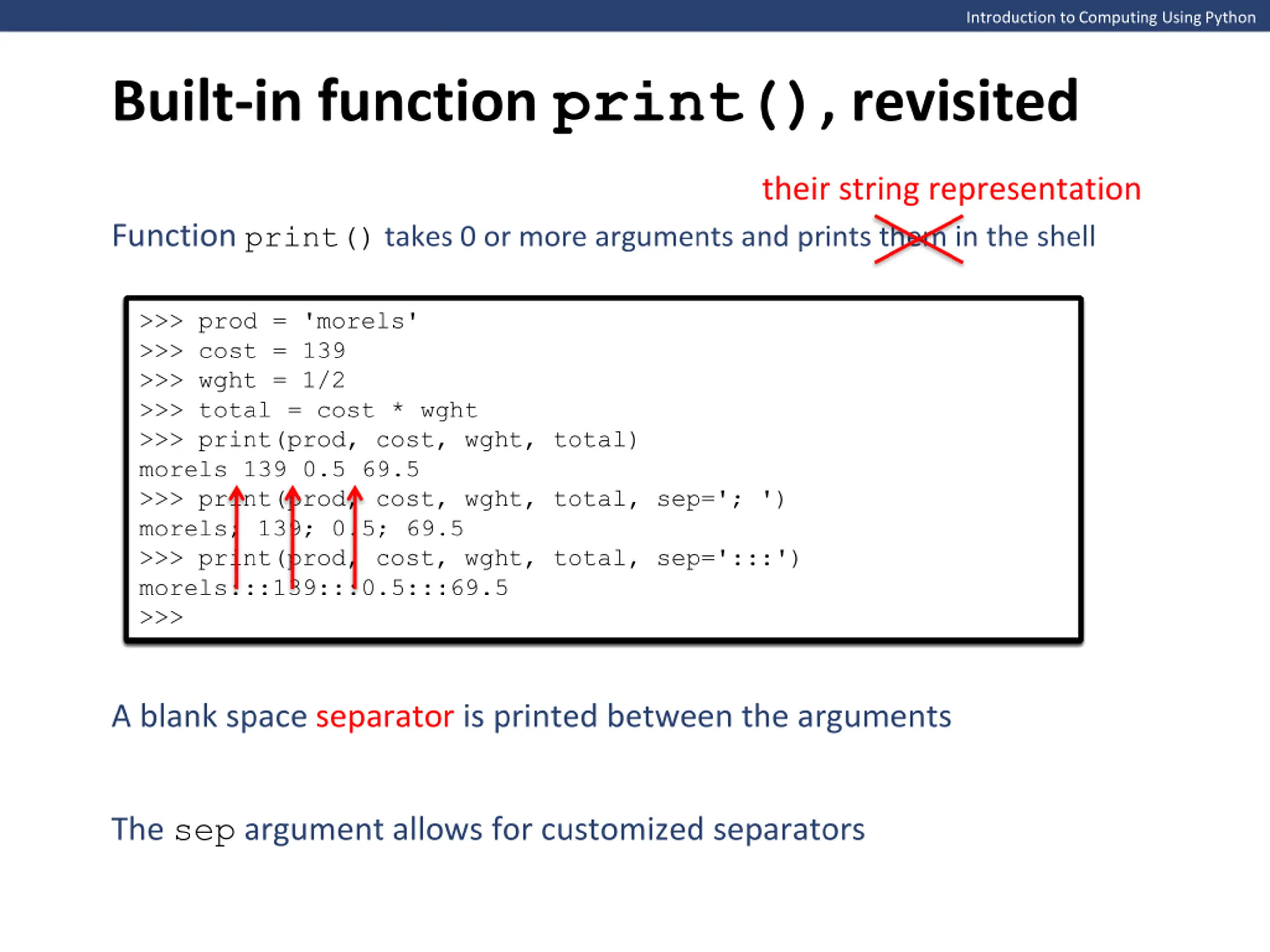 Introduction to Computing Using Python Built-in function print(), revisited their string representation Function print() takes 0 or more arguments and prints them in the shell >>> prod = 'morels' >>> cost = 139 >>> wght = 1/2 >>> total = cost * wght >>> >>> print(prod, cost, wght, total) morels 139 0.5 69.5 >>> >>> print(prod, cost, wght, total, sep='; ') morels; 139; 0.5; 69.5 >>> >>> print(prod, cost, wght, total, sep=':::') morels:::139:::0.5:::69.5 >>> >>> prod = 'morels' >>> cost = 139 >>> wght = 1/2 >>> total = cost * wght >>> total = cost * wght >>> print(prod, cost, wght, total) morels 139 0.5 69.5 morels 139 0.5 69.5 >>> print(prod, cost, wght, total, sep='; ') morels; 139; 0.5; 69.5 >>> prod = 'morels' >>> cost = 139 >>> wght = 1/2 >>> wght = 1/2 >>> total = cost * wght >>> print(prod, cost, wght, total) >>> prod = 'morels' >>> cost = 139 A blank space separator is printed between the arguments The sep argument allows for customized separators