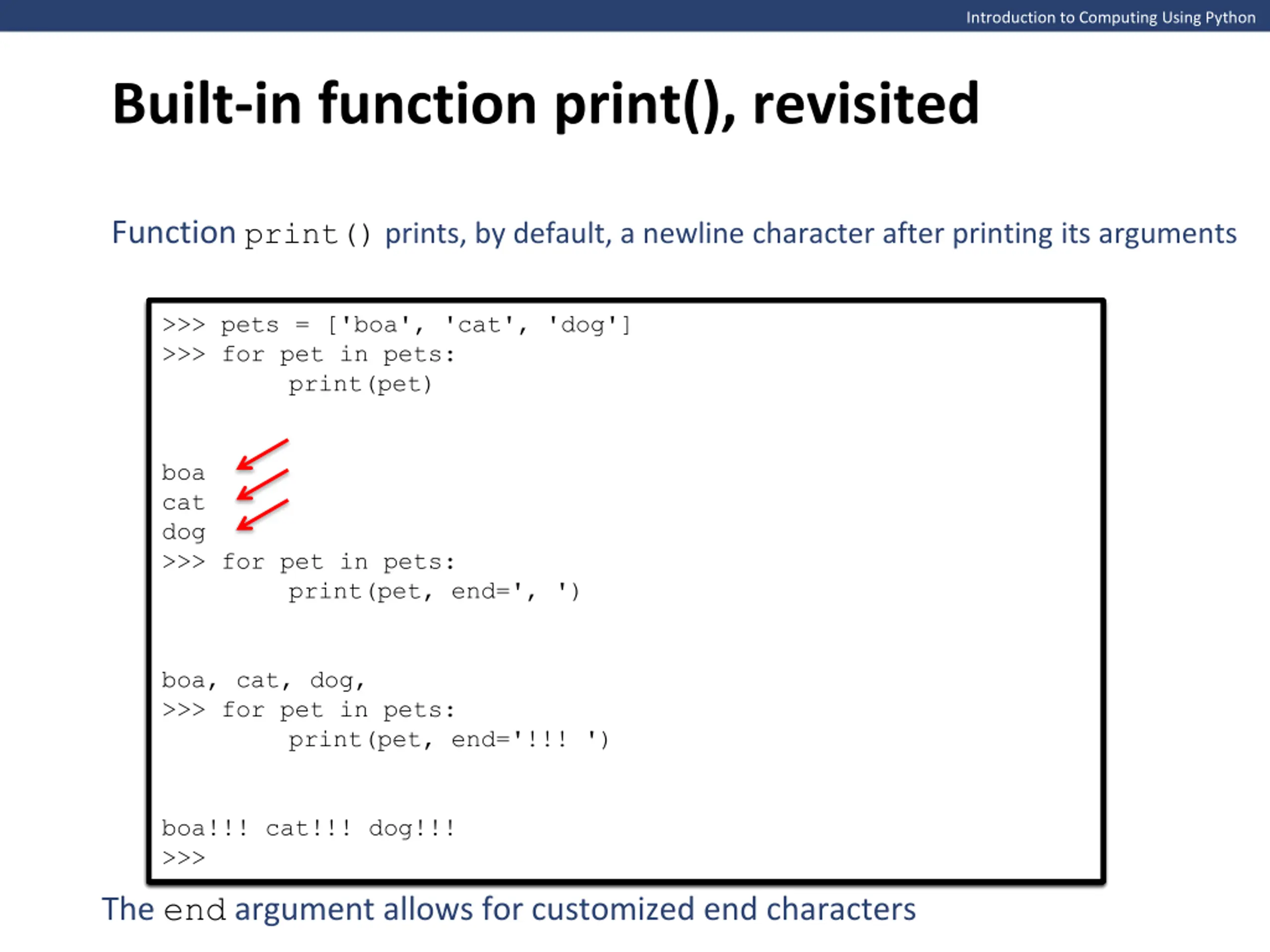 Introduction to Computing Using Python Built-in function print(), revisited Function print() prints, by default, a newline character after printing its arguments >>> pets = ['boa', 'cat', 'dog'] >>> for pet in pets: print(pet) print(pet) print(pet) print(pet) >>> pets = ['boa', 'cat', 'dog'] >>> for pet in pets: >>> for pet in pets: >>> for pet in pets: >>> pets = ['boa', 'cat', 'dog'] >>> pets = ['boa', 'cat', 'dog'] boa cat dog >>> >>> >>> for pet in pets: print(pet, end=', ') print(pet, end=', ') boa\n cat\n dog\n dog dog >>> for pet in pets: boa cat cat boa boa, cat, dog, >>> >>> for pet in pets: print(pet, end='!!! ') boa, cat, dog, boa!!! cat!!! dog!!! >>> The end argument allows for customized end characters