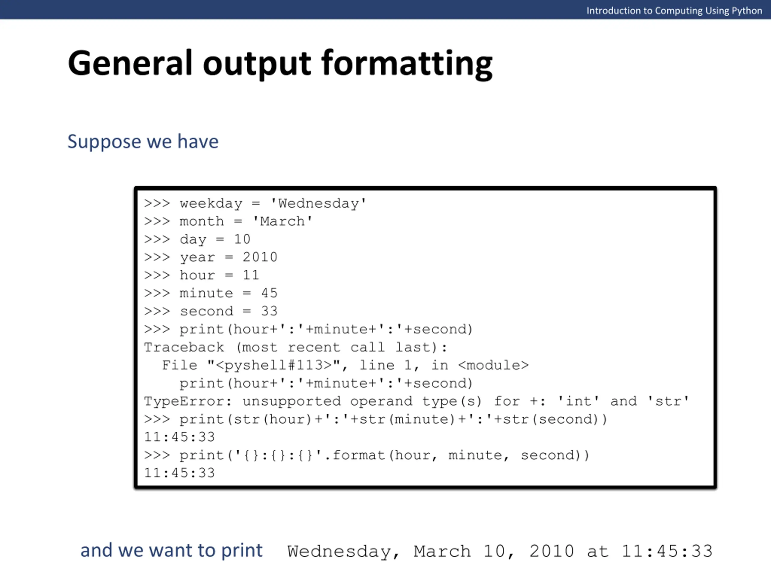 Introduction to Computing Using Python General output formatting Suppose we have >>> weekday = 'Wednesday' >>> month = 'March' >>> day = 10 >>> year = 2010 >>> hour = 11 >>> minute = 45 >>> second = 33 >>> >>> print(hour+':'+minute+':'+second) Traceback (most recent call last): File "<pyshell#113>", line 1, in <module> print(hour+':'+minute+':'+second) TypeError: unsupported operand type(s) for +: 'int' and 'str' >>> >>> print(str(hour)+':'+str(minute)+':'+str(second)) 11:45:33 >>> >>> print('{}:{}:{}'.format(hour, minute, second)) 11:45:33 >>> weekday = 'Wednesday' >>> month = 'March' >>> day = 10 >>> year = 2010 >>> hour = 11 >>> minute = 45 >>> second = 33 >>> second = 33 >>> print(hour+':'+minute+':'+second) Traceback (most recent call last): File "<pyshell#113>", line 1, in <module> print(hour+':'+minute+':'+second) TypeError: unsupported operand type(s) for +: 'int' and 'str' TypeError: unsupported operand type(s) for +: 'int' and 'str' >>> print(str(hour)+':'+str(minute)+':'+str(second)) 11:45:33 >>> weekday = 'Wednesday' >>> month = 'March' >>> day = 10 >>> year = 2010 >>> hour = 11 >>> minute = 45 >>> minute = 45 >>> second = 33 >>> print(hour+':'+minute+':'+second) Traceback (most recent call last): File "<pyshell#113>", line 1, in <module> print(hour+':'+minute+':'+second) >>> weekday = 'Wednesday' >>> month = 'March' >>> day = 10 >>> year = 2010 >>> hour = 11 and we want to print Wednesday, March 10, 2010 at 11:45:33