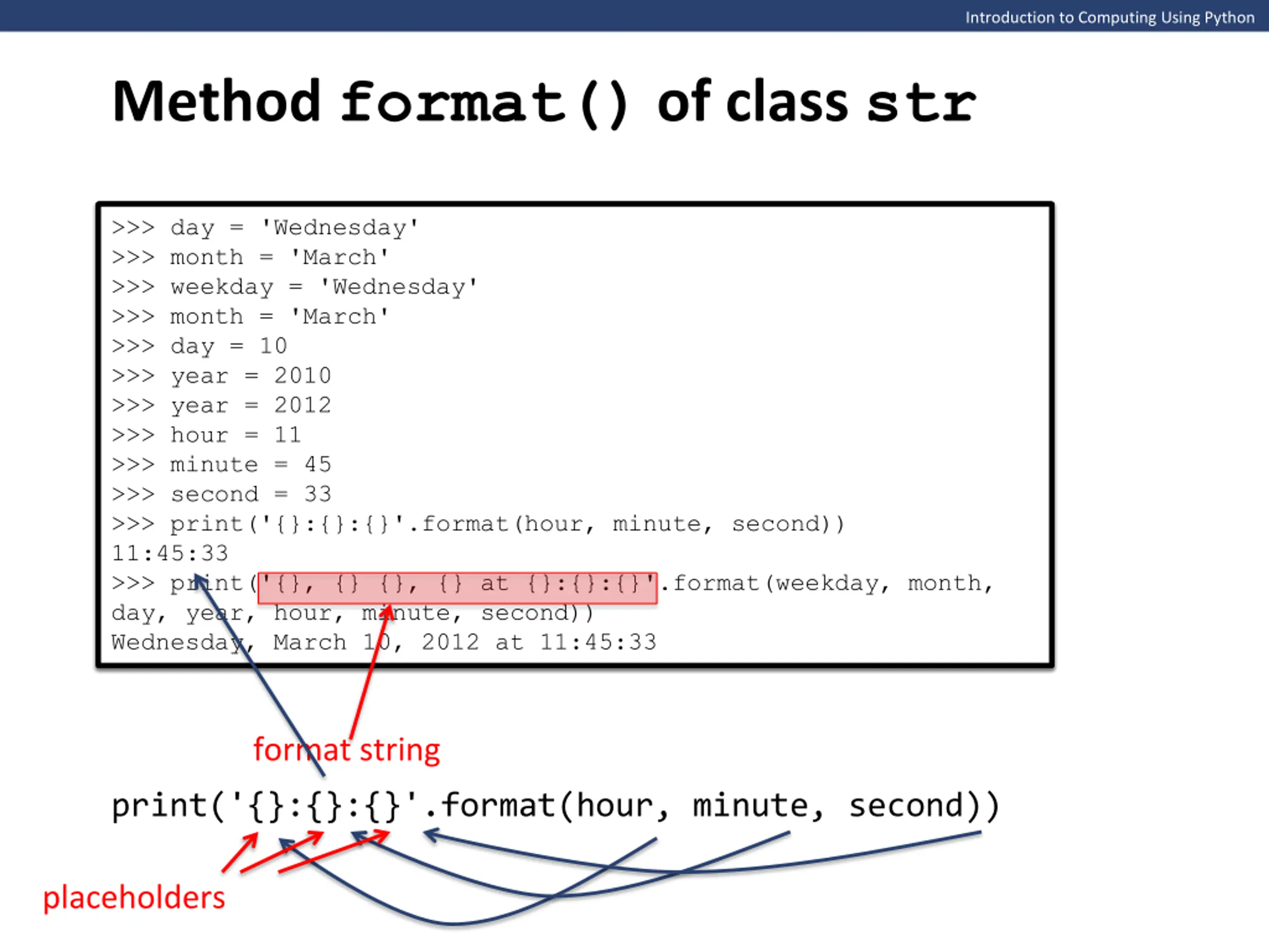 Introduction to Computing Using Python Method format() of class str >>> day = 'Wednesday' >>> month = 'March' >>> weekday = 'Wednesday' >>> month = 'March' >>> day = 10 >>> year = 2010 >>> year = 2012 >>> hour = 11 >>> minute = 45 >>> second = 33 >>> print('{}:{}:{}'.format(hour, minute, second)) 11:45:33 >>> >>> print('{}, {} {}, {} at {}:{}:{}'.format(weekday, month, day, year, hour, minute, second)) Wednesday, March 10, 2012 at 11:45:33 >>> day = 'Wednesday' >>> month = 'March' >>> weekday = 'Wednesday' >>> month = 'March' >>> day = 10 >>> year = 2010 >>> year = 2012 >>> hour = 11 >>> minute = 45 >>> second = 33 >>> print('{}:{}:{}'.format(hour, minute, second)) 11:45:33 format string print('{}:{}:{}'.format(hour, minute, second)) placeholders
