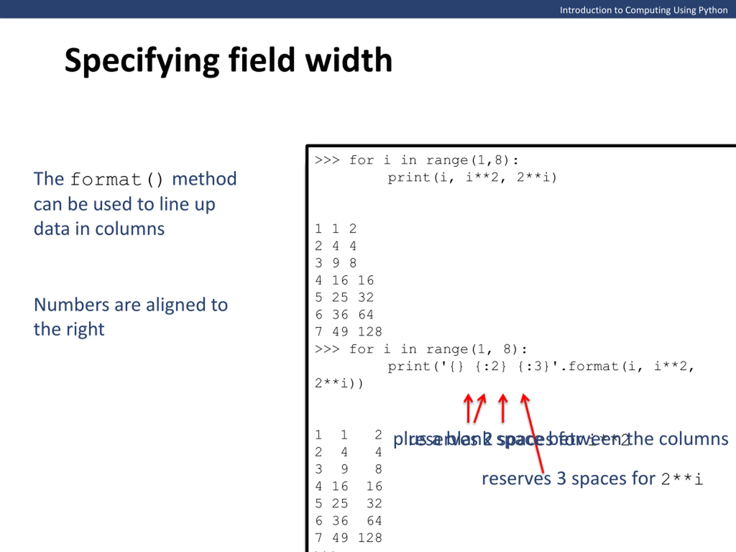 Introduction to Computing Using Python Specifying field width >>> for i in range(1,8): print(i, i**2, 2**i) The format() method can be used to line up data in columns >>> for i in range(1,8): print(i, i**2, 2**i) 1 1 2 2 4 4 3 9 8 4 16 16 5 25 32 6 36 64 7 49 128 >>> for i in range(1, 8): print('{} {:2} {:3}'.format(i, i**2, 2**i)) 1 1 2 2 4 4 3 9 8 4 16 16 5 25 32 6 36 64 7 49 128 >>> Numbers are aligned to the right 1 1 2 2 4 4 3 9 8 4 16 16 5 25 32 6 36 64 7 49 128 >>> reserves 2 spaces for i**2 plus a blank space between the columns reserves 3 spaces for 2**i