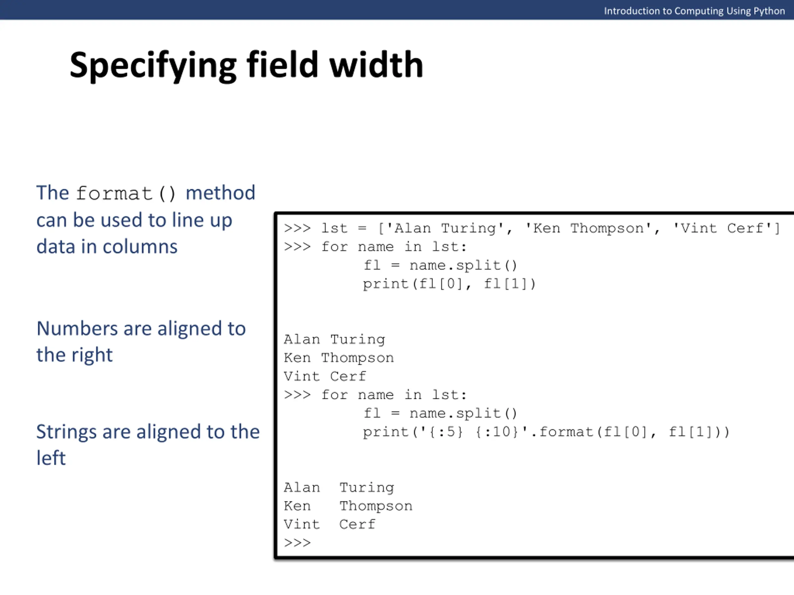 Introduction to Computing Using Python Specifying field width The format() method can be used to line up data in columns >>> lst = ['Alan Turing', 'Ken Thompson', 'Vint Cerf'] >>> for name in lst: fl = name.split() print(fl[0], fl[1]) print(fl[0], fl[1]) >>> lst = ['Alan Turing', 'Ken Thompson', 'Vint Cerf'] >>> for name in lst: fl = name.split() Alan Turing Ken Thompson Vint Cerf >>> >>> for name in lst: fl = name.split() print('{:5} {:10}'.format(fl[0], fl[1])) Alan Turing Ken Thompson Vint Cerf Numbers are aligned to the right Strings are aligned to the left Alan Turing Ken Thompson Vint Cerf >>>