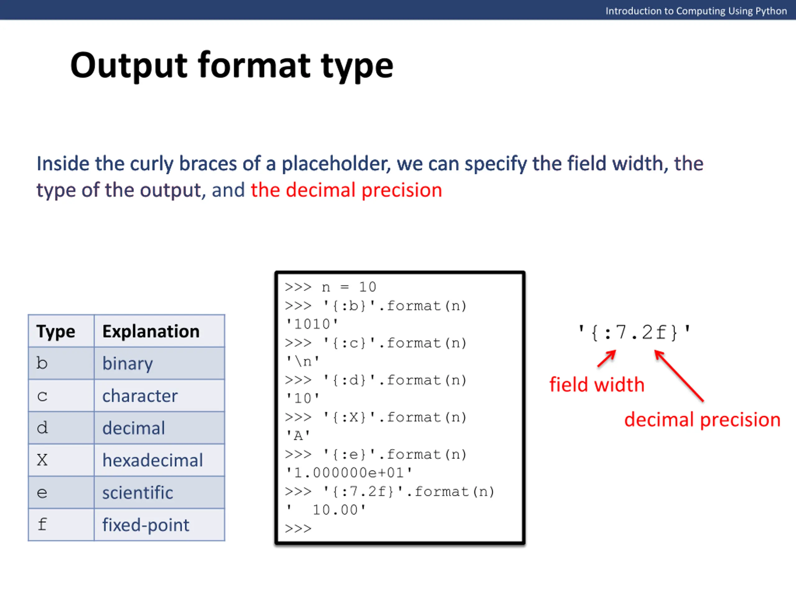 Introduction to Computing Using Python Output format type Inside the curly braces of a placeholder, we can specify the field width Inside the curly braces of a placeholder, we can specify the field width, the type of the output type of the output, and the decimal precision Inside the curly braces of a placeholder, we can specify the field width, the >>> n = 10 >>> '{:b}'.format(n) '1010' >>> '{:c}'.format(n) '\n' >>> '{:d}'.format(n) '10' >>> '{:X}'.format(n) 'A' >>> '{:e}'.format(n) '1.000000e+01' >>> n = 10 >>> '{:b}'.format(n) '1010' >>> '{:c}'.format(n) '\n' >>> '{:d}'.format(n) '10' >>> '{:X}'.format(n) 'A' >>> '{:e}'.format(n) '1.000000e+01' >>> >>> '{:7.2f}'.format(n) ' 10.00' >>> '{:7.2f}' Type b c d X e f Explanation binary field width character decimal precision decimal hexadecimal scientific fixed-point