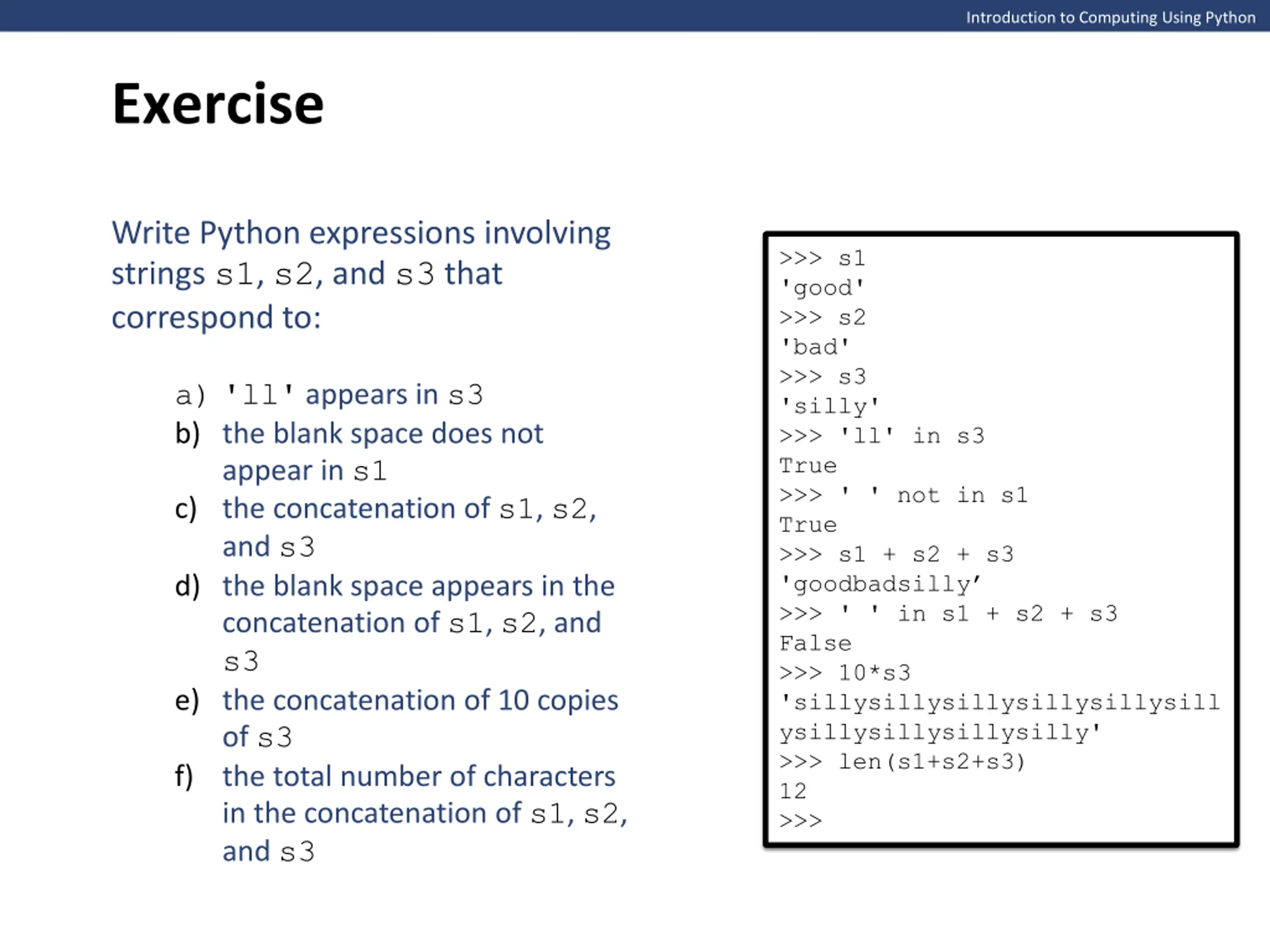 Introduction to Computing Using Python Exercise Write Python expressions involving strings s1, s2, and s3 that correspond to: >>> s1 'good' >>> s2 'bad' >>> s3 'silly' >>> >>> 'll' in s3 True >>> ' ' not in s1 True >>> s1 + s2 + s3 'goodbadsilly >>> ' ' in s1 + s2 + s3 False >>> 10*s3 'sillysillysillysillysillysill ysillysillysillysilly' >>> len(s1+s2+s3) 12 >>> >>> s1 'good' >>> s2 'bad' >>> s3 'silly' a) 'll' appears in s3 b) the blank space does not appear in s1 c) the concatenation of s1, s2, and s3 d) the blank space appears in the concatenation of s1, s2, and s3 e) the concatenation of 10 copies of s3 f) the total number of characters in the concatenation of s1, s2, and s3