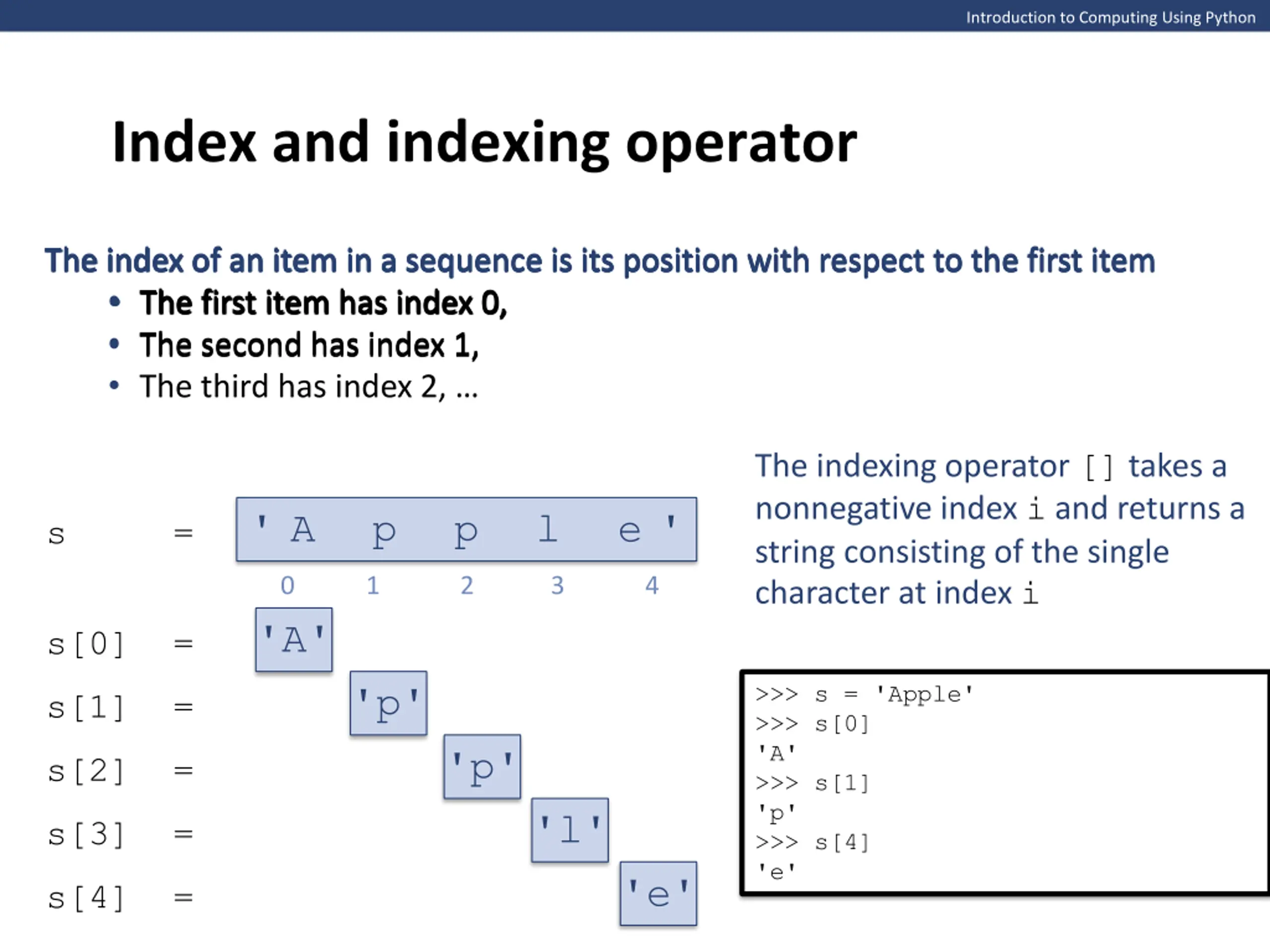 Introduction to Computing Using Python Index and indexing operator The index of an item in a sequence is its position with respect to the first item The index of an item in a sequence is its position with respect to the first item The first item has index 0, The index of an item in a sequence is its position with respect to the first item The index of an item in a sequence is its position with respect to the first item The first item has index 0, The first item has index 0, The second has index 1, The second has index 1, The third has index 2, The indexing operator [] takes a nonnegative index i and returns a string consisting of the single character at index i ' A p p l e ' s = 0 1 2 3 4 'A' s[0] = 'p' >>> s = 'Apple' >>> s[0] 'A' >>> s[1] 'p' >>> s[4] 'e' s[1] = 'p' s[2] = 'l' s[3] = 'e' s[4] =