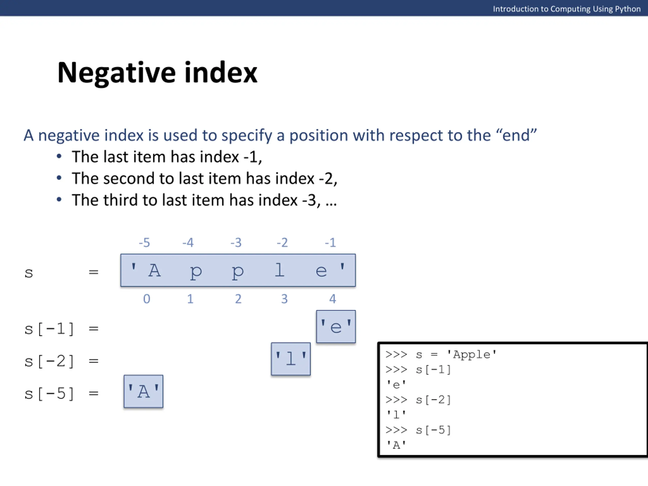Introduction to Computing Using Python Negative index A negative index is used to specify a position with respect to the end The last item has index -1, The second to last item has index -2, The third to last item has index -3, -5 -4 -3 -2 -1 ' A p p l e ' s = 0 1 2 3 4 'e' s[-1] = 'l' >>> s = 'Apple' >>> s[-1] 'e' >>> s[-2] 'l' >>> s[-5] 'A' s[-2] = 'A' s[-5] =