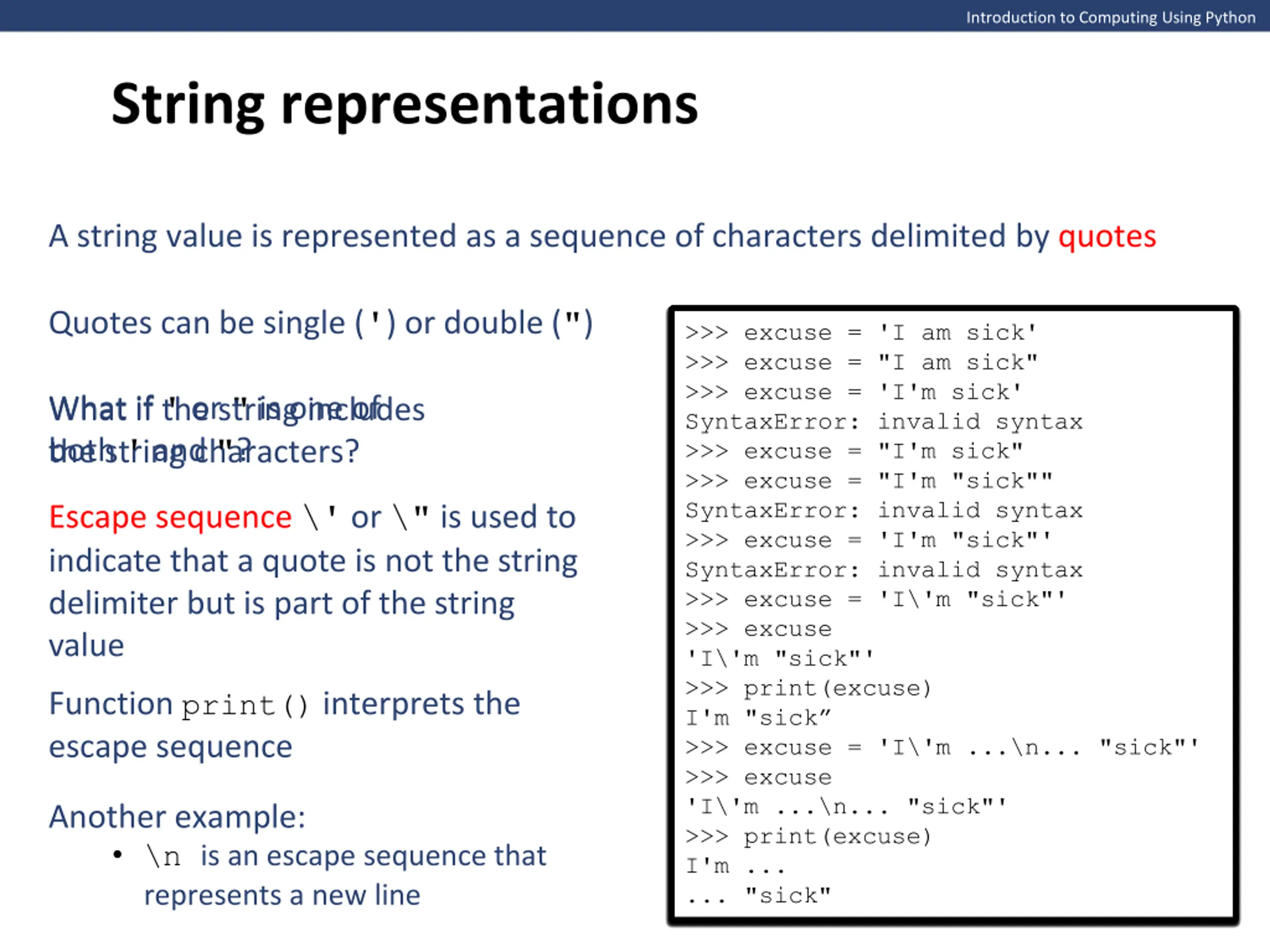 Introduction to Computing Using Python String representations A string value is represented as a sequence of characters delimited by quotes Quotes can be single (') or double (") >>> excuse = 'I am sick' >>> excuse = "I am sick" >>> >>> excuse = 'I'm sick' SyntaxError: invalid syntax >>> >>> excuse = "I'm sick" >>> >>> excuse = "I'm "sick"" SyntaxError: invalid syntax >>> excuse = 'I'm "sick"' SyntaxError: invalid syntax >>> >>> excuse = 'I\'m "sick"' >>> >>> excuse 'I\'m "sick"' >>> >>> print(excuse) I'm "sick" >>> >>> excuse = 'I\'m ...\n... "sick"' >>> >>> excuse 'I\'m ...\n... "sick"' >>> >>> print(excuse) I'm ... ... "sick" >>> excuse = 'I am sick' >>> excuse = "I am sick" >>> excuse = "I am sick" >>> excuse = 'I'm sick' SyntaxError: invalid syntax SyntaxError: invalid syntax >>> excuse = "I'm sick" >>> excuse = "I'm sick" >>> excuse = "I'm "sick"" SyntaxError: invalid syntax >>> excuse = 'I'm "sick"' SyntaxError: invalid syntax SyntaxError: invalid syntax >>> excuse = 'I\'m "sick"' >>> excuse = 'I\'m "sick"' >>> excuse 'I\'m "sick"' 'I\'m "sick"' >>> print(excuse) I'm "sick I'm "sick >>> excuse = 'I\'m ...\n... "sick"' >>> excuse = 'I\'m ...\n... "sick"' >>> excuse 'I\'m ...\n... "sick"' >>> excuse = 'I am sick' >>> excuse = 'I am sick' >>> excuse = "I am sick" >>> excuse = 'I'm sick' >>> excuse = 'I'm sick' SyntaxError: invalid syntax SyntaxError: invalid syntax >>> excuse = "I'm sick" >>> excuse = "I'm "sick"" SyntaxError: invalid syntax >>> excuse = 'I'm "sick"' >>> excuse = 'I'm "sick"' SyntaxError: invalid syntax SyntaxError: invalid syntax >>> excuse = 'I\'m "sick"' >>> excuse >>> excuse 'I\'m "sick"' >>> print(excuse) >>> print(excuse) I'm "sick >>> excuse = 'I am sick' >>> excuse = "I am sick" >>> excuse = "I am sick" >>> excuse = 'I'm sick' >>> excuse = 'I'm sick' SyntaxError: invalid syntax >>> excuse = "I'm sick" >>> excuse = "I'm "sick"" SyntaxError: invalid syntax SyntaxError: invalid syntax >>> excuse = 'I'm "sick"' >>> excuse = 'I'm "sick"' SyntaxError: invalid syntax >>> excuse = 'I\'m "sick"' >>> excuse = 'I\'m "sick"' >>> excuse 'I\'m "sick"' >>> excuse = 'I am sick' >>> excuse = 'I am sick' >>> excuse = "I am sick" >>> excuse = "I am sick" >>> excuse = 'I'm sick' SyntaxError: invalid syntax >>> excuse = "I'm sick" >>> excuse = "I'm "sick"" >>> excuse = "I'm "sick"" SyntaxError: invalid syntax SyntaxError: invalid syntax >>> excuse = 'I'm "sick"' SyntaxError: invalid syntax >>> excuse = 'I am sick' >>> excuse = 'I am sick' >>> excuse = "I am sick" >>> excuse = 'I'm sick' SyntaxError: invalid syntax >>> excuse = "I'm sick >>> excuse = "I'm sick" >>> excuse = "I'm "sick"" >>> excuse = 'I am sick' >>> excuse = "I am sick" >>> excuse = 'I'm sick' SyntaxError: invalid syntax What if ' or " is one of the string characters? both ' and "? What if the string includes Escape sequence \' or \" is used to indicate that a quote is not the string delimiter but is part of the string value Function print() interprets the escape sequence Another example: \n is an escape sequence that represents a new line