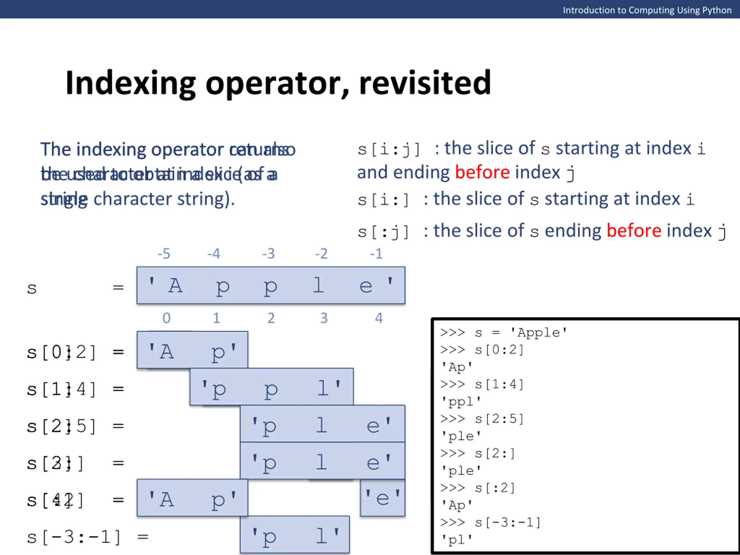 Introduction to Computing Using Python Indexing operator, revisited s[i:j] : the slice of s starting at index i and ending before index j s[i:] : the slice of s starting at index i s[:j] : the slice of s ending before index j The indexing operator can also be used to obtain a slice of a The indexing operator returns the character at index i (as a single character string). string -5 -4 -3 -2 -1 ' A p p l e ' s = 0 1 2 3 4 >>> s = 'Apple' >>> s[0:2] 'Ap' >>> s[1:4] 'ppl' >>> s[2:5] 'ple' >>> s[2:] 'ple' s[0:2] = 'Ap' 'A' s[0] = 'p' 'ppl' >>> s = 'Apple' >>> s[0] 'A' >>> s[1] 'p' >>> s[4] 'e' >>> s[:2] 'Ap' >>> s[-3:-1] 'pl' s[1] = s[1:4] = 'p' 'ple' 'ple' s[2] s[2:5] = = 'l' s[3] = s[2:] = s[:2] = 'Ap' 'e' s[4] = 'pl' s[-3:-1] =