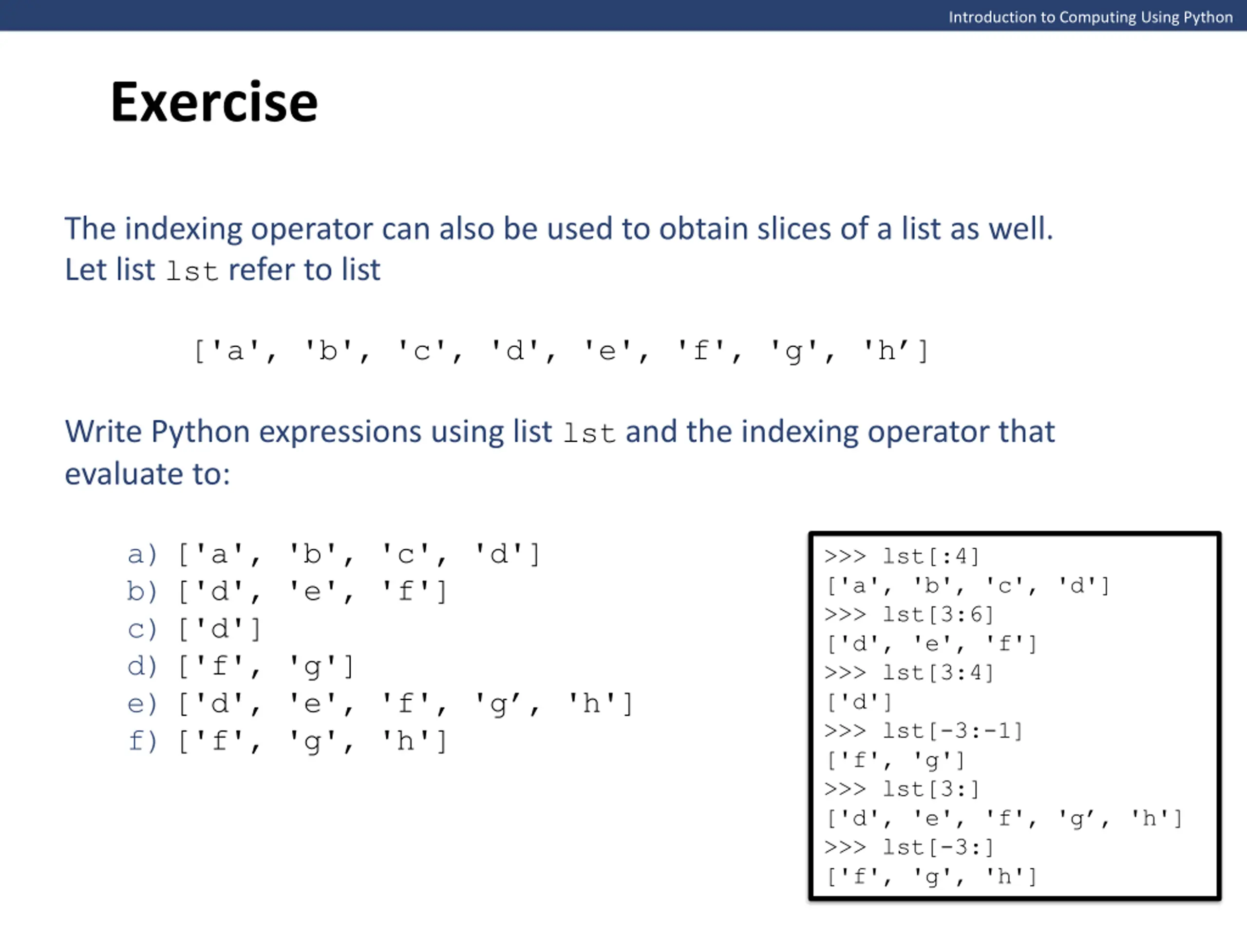 Introduction to Computing Using Python Exercise The indexing operator can also be used to obtain slices of a list as well. Let list lst refer to list ['a', 'b', 'c', 'd', 'e', 'f', 'g', 'h ] Write Python expressions using list lst and the indexing operator that evaluate to: a) ['a', 'b', 'c', 'd'] b) ['d', 'e', 'f'] c) ['d'] d) ['f', 'g'] e) ['d', 'e', 'f', 'g , 'h'] f) ['f', 'g', 'h'] >>> lst[:4] ['a', 'b', 'c', 'd'] >>> lst[3:6] ['d', 'e', 'f'] >>> lst[3:4] ['d'] >>> lst[-3:-1] ['f', 'g'] >>> lst[3:] ['d', 'e', 'f', 'g , 'h'] >>> lst[-3:] ['f', 'g', 'h']