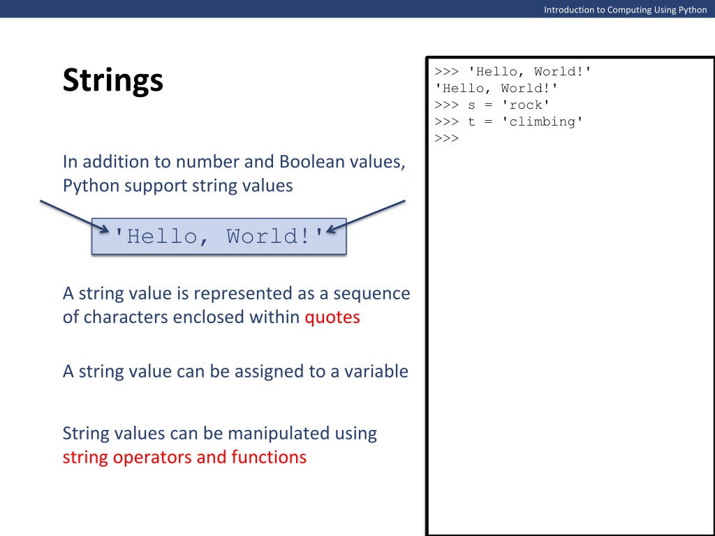 Introduction to Computing Using Python >>> 'Hello, World!' 'Hello, World!' >>> >>> s = 'rock' >>> t = 'climbing' >>> >>> 'Hello, World!' 'Hello, World!' Strings In addition to number and Boolean values, Python support string values "Hello, World!" 'Hello, World!' A string value is represented as a sequence of characters enclosed within quotes A string value can be assigned to a variable String values can be manipulated using string operators and functions