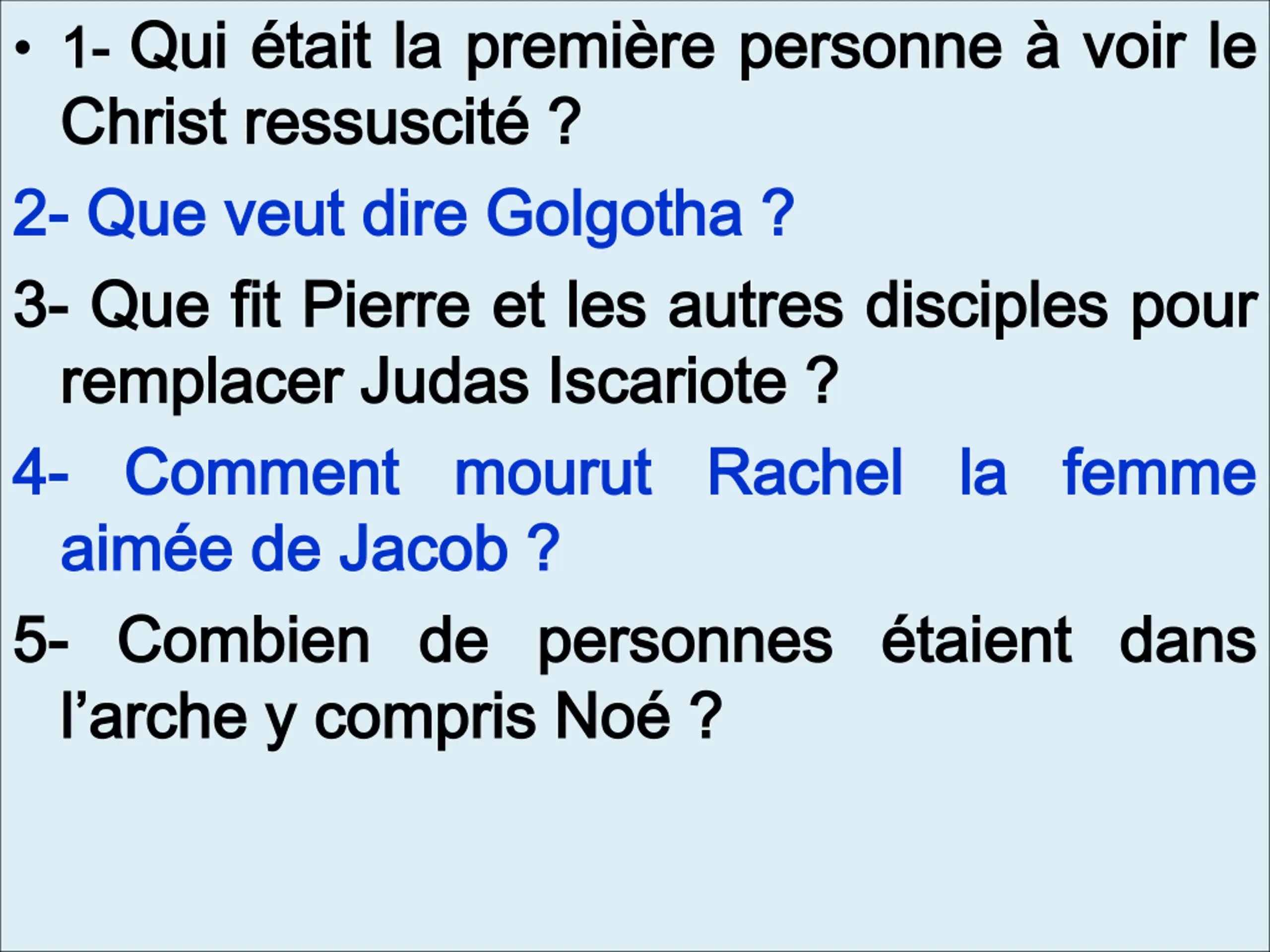 1 1- - Qui Christ Christ ressuscit ressuscit ? ? 2 2- - Que Que veut veut dire 3 3- - Que Que fit fit Pierre remplacer remplacer Judas 4 4- - Comment Comment mourut aim e aim e de de Jacob 5 5- - Combien Combien de l arche l arche y y compris compris No Qui tait tait la la premi re premi re personne personne voir voir le le dire Golgotha Golgotha ? ? Pierre et et les Judas Iscariote Iscariote ? ? mourut Rachel Jacob ? ? de personnes personnes taient No ? ? les autres autres disciples disciples pour pour Rachel la la femme femme taient dans dans