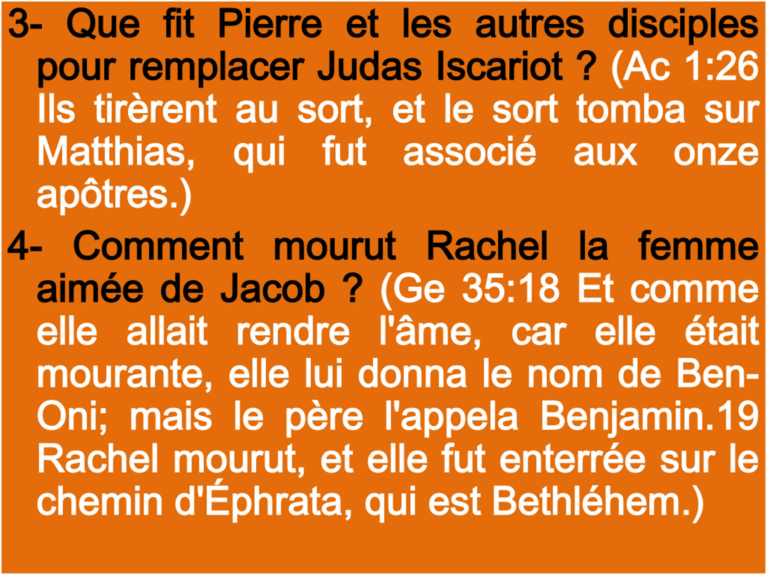 3 3- - Que Que fit fit Pierre pour pour remplacer remplacer Judas Ils Ils tir rent tir rent au Matthias, Matthias, ap tres ap tres. .) ) 4 4- - Comment Comment mourut aim e aim e de de Jacob elle elle allait allait rendre mourante, mourante, elle Oni Oni; ; mais mais le le p re Rachel Rachel mourut, mourut, et et elle chemin chemin d' d' phrata phrata, , qui Pierre et et les Judas Iscariot au sort, sort, et et le le sort qui qui fut fut les autres autres disciples Iscariot ? ? ( (Ac sort tomba tomba sur associ associ aux aux disciples Ac 1 1: :26 26 sur onze onze mourut Rachel Jacob ? ? (Ge (Ge 35 rendre l' me, l' me, car elle lui lui donna donna le le nom p re l'appela l'appela Benjamin elle fut fut enterr e qui est est Bethl hem Rachel la la femme 35: :18 18 Et Et comme car elle nom de Benjamin. .19 enterr e sur Bethl hem. .) ) femme comme elle tait de Ben Ben- - tait 19 sur le le