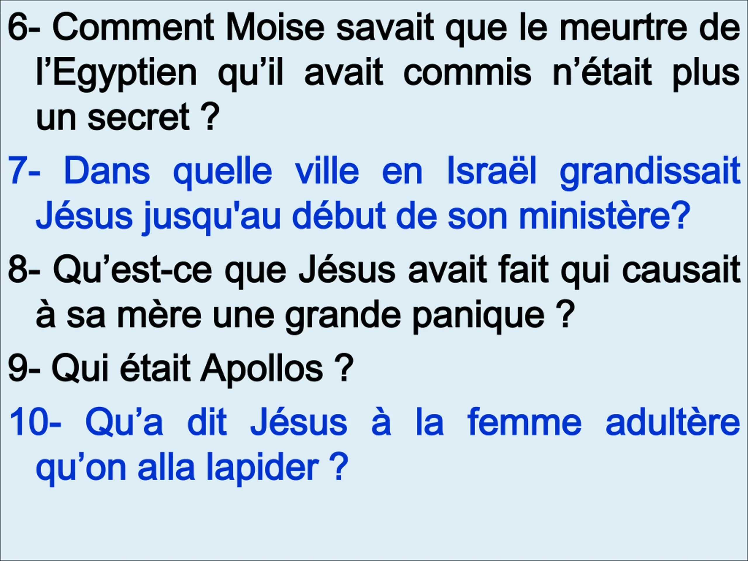 6 6- - Comment Comment Moise l Egyptien l Egyptien qu il un un secret secret ? ? 7 7- - Dans Dans quelle J sus J sus jusqu'au jusqu'au d but 8 8- - Qu est Qu est- -ce ce que sa sa m re m re une 9 9- - Qui Qui tait tait Apollos 10 10- - Qu a Qu a dit dit J sus qu on qu on alla alla lapider Moise savait qu il avait avait commis savait que commis n tait que le le meurtre meurtre de n tait plus de plus quelle ville ville en d but de que J sus J sus avait une grande grande panique Apollos ? ? J sus la la femme lapider ? ? en Isra l Isra l grandissait grandissait de son son minist re? minist re? avait fait fait qui qui causait panique ? ? causait femme adult re adult re