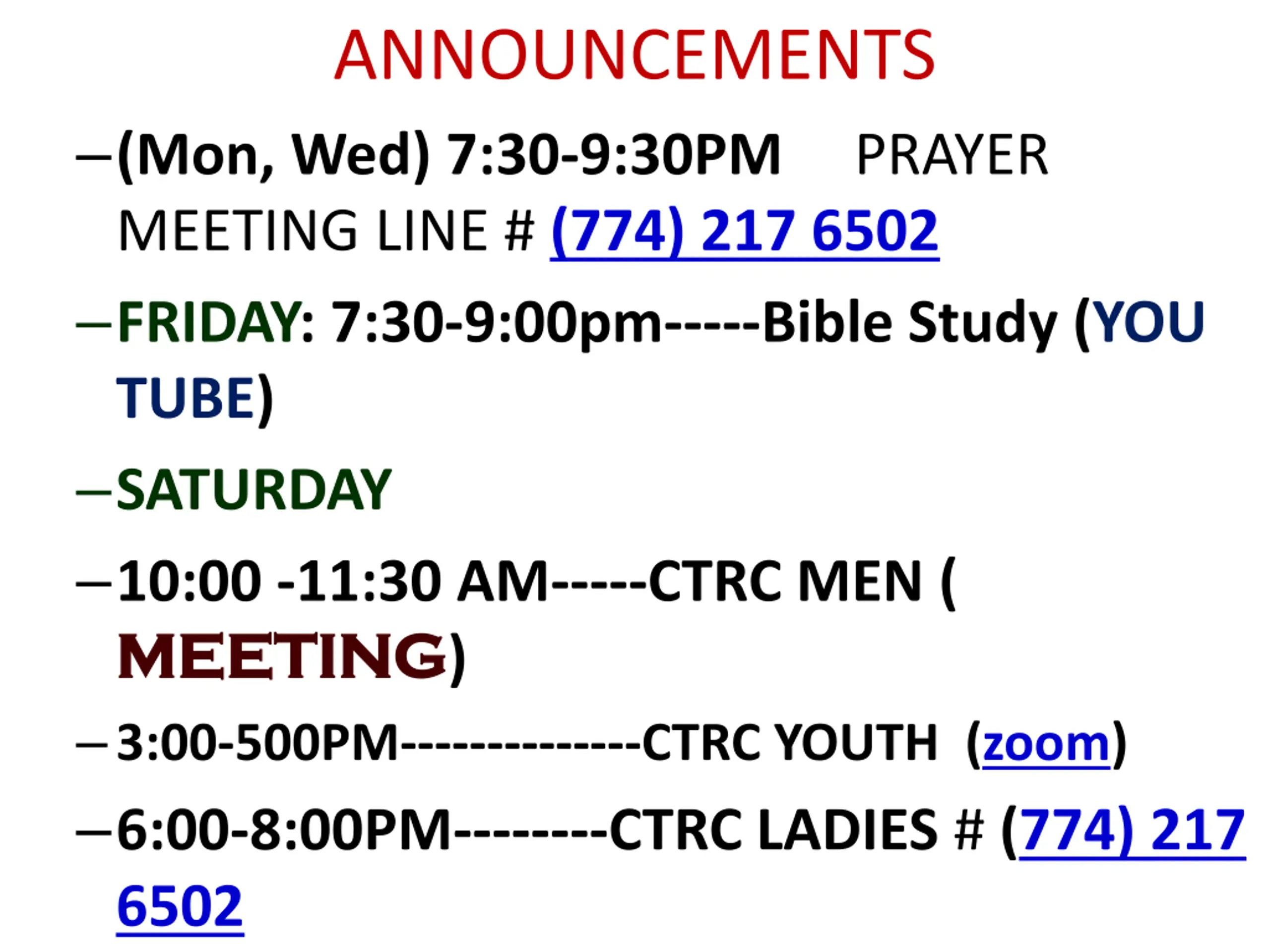ANNOUNCEMENTS (Mon, Wed) 7:30-9:30PM PRAYER MEETING LINE # (774) 217 6502 FRIDAY: 7:30-9:00pm-----Bible Study (YOU TUBE) SATURDAY 10:00 -11:30 AM-----CTRC MEN ( MEETING MEETING) 3:00-500PM--------------CTRC YOUTH (zoom) 6:00-8:00PM--------CTRC LADIES # (774) 217 6502