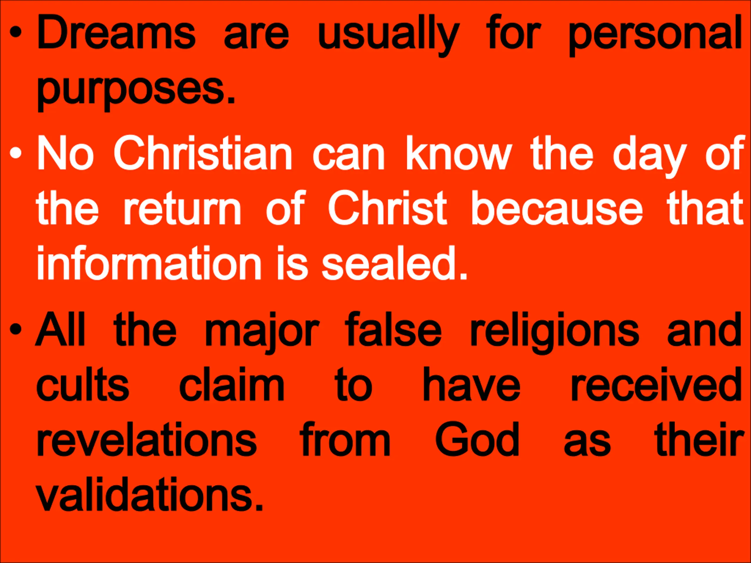 Dreams Dreams are purposes purposes. . No No Christian Christian can the the return return of of Christ information information is is sealed All All the the major major false cults cults claim claim revelations revelations validations validations. . are usually usually for for personal personal can know know the Christ because because that sealed. . false religions religions and to to have have from from God God the day day of of that and received received as as their their