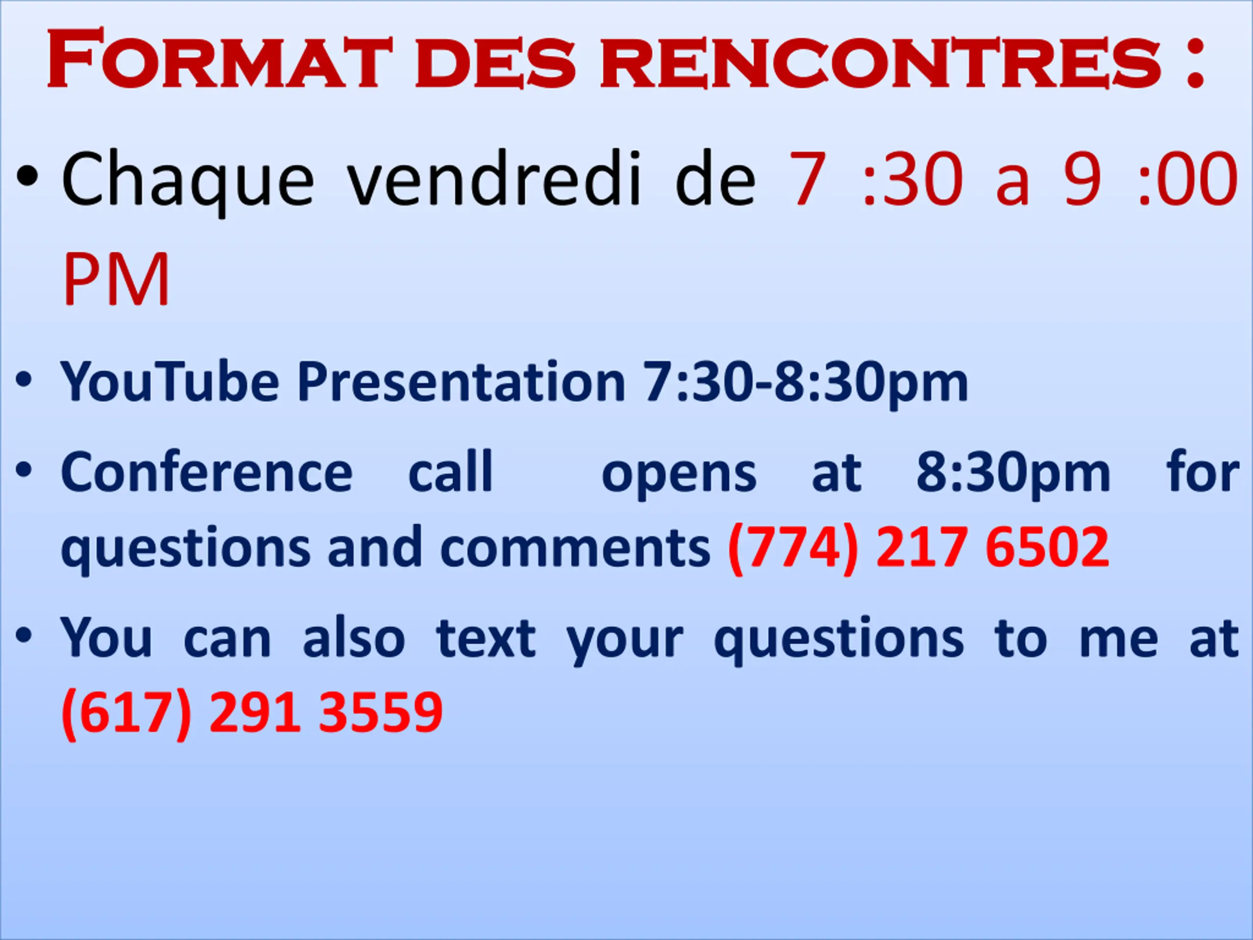 Format Format des rencontres des rencontres : : Chaque vendredi de 7 :30 a 9 :00 PM YouTube Presentation 7:30-8:30pm Conference call opens at 8:30pm for questions and comments (774) 217 6502 You can also text your questions to me at (617) 291 3559