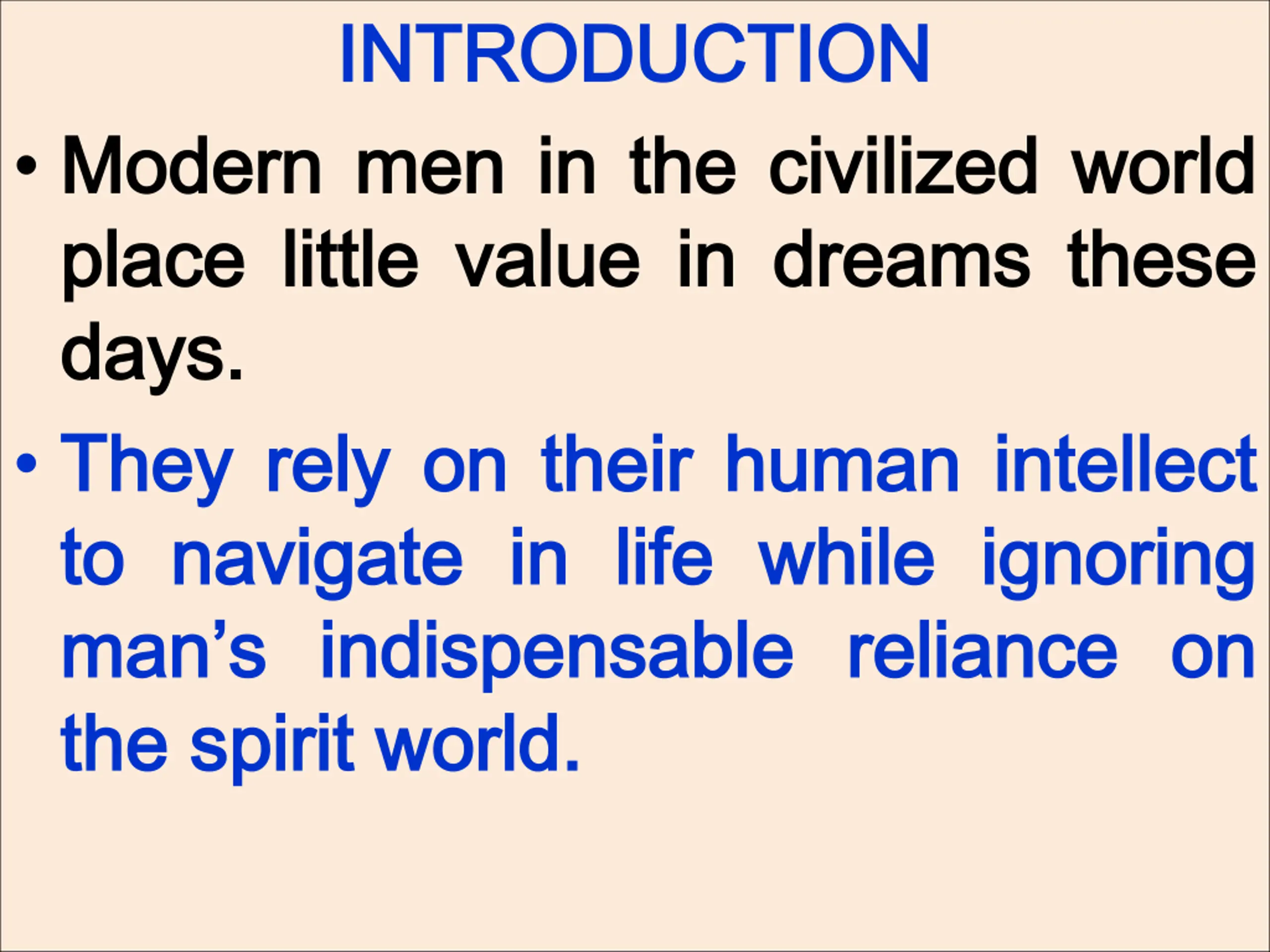INTRODUCTION INTRODUCTION Modern men men in in the place place little little value value in in dreams days days. . They They rely rely on on their to to navigate navigate in in life man s man s indispensable indispensable reliance the the spirit spirit world world. . Modern the civilized civilized world dreams these world these their human human intellect life while while ignoring reliance on intellect ignoring on