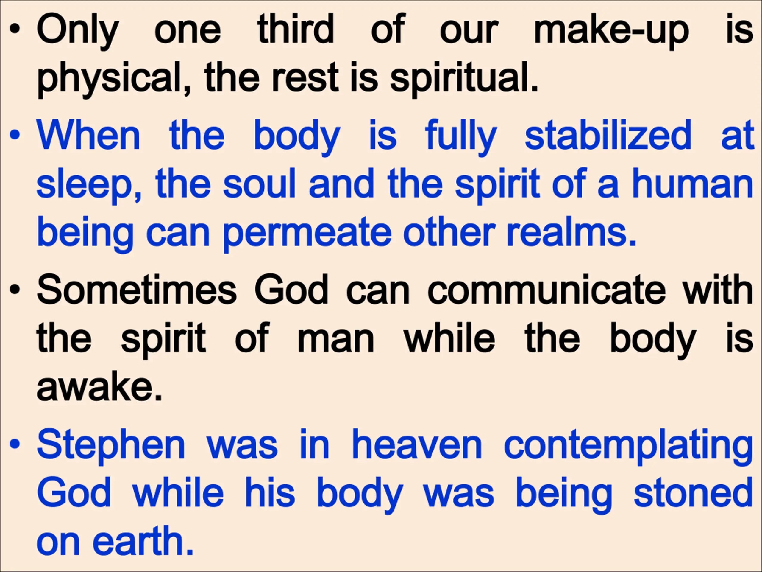 Only Only one physical, physical, the When When the sleep, sleep, the being being can Sometimes Sometimes God the the spirit spirit of of man awake awake. . Stephen Stephen was God God while while his on on earth earth. . one third the rest the body the soul soul and can permeate permeate other God can man while third of of our rest is is spiritual spiritual. . body is is fully and the the spirit our make make- -up up is is fully stabilized stabilized at at spirit of of a a human other realms realms. . can communicate communicate with while the the body human with body is is was in in heaven his body body was heaven contemplating contemplating was being being stoned stoned
