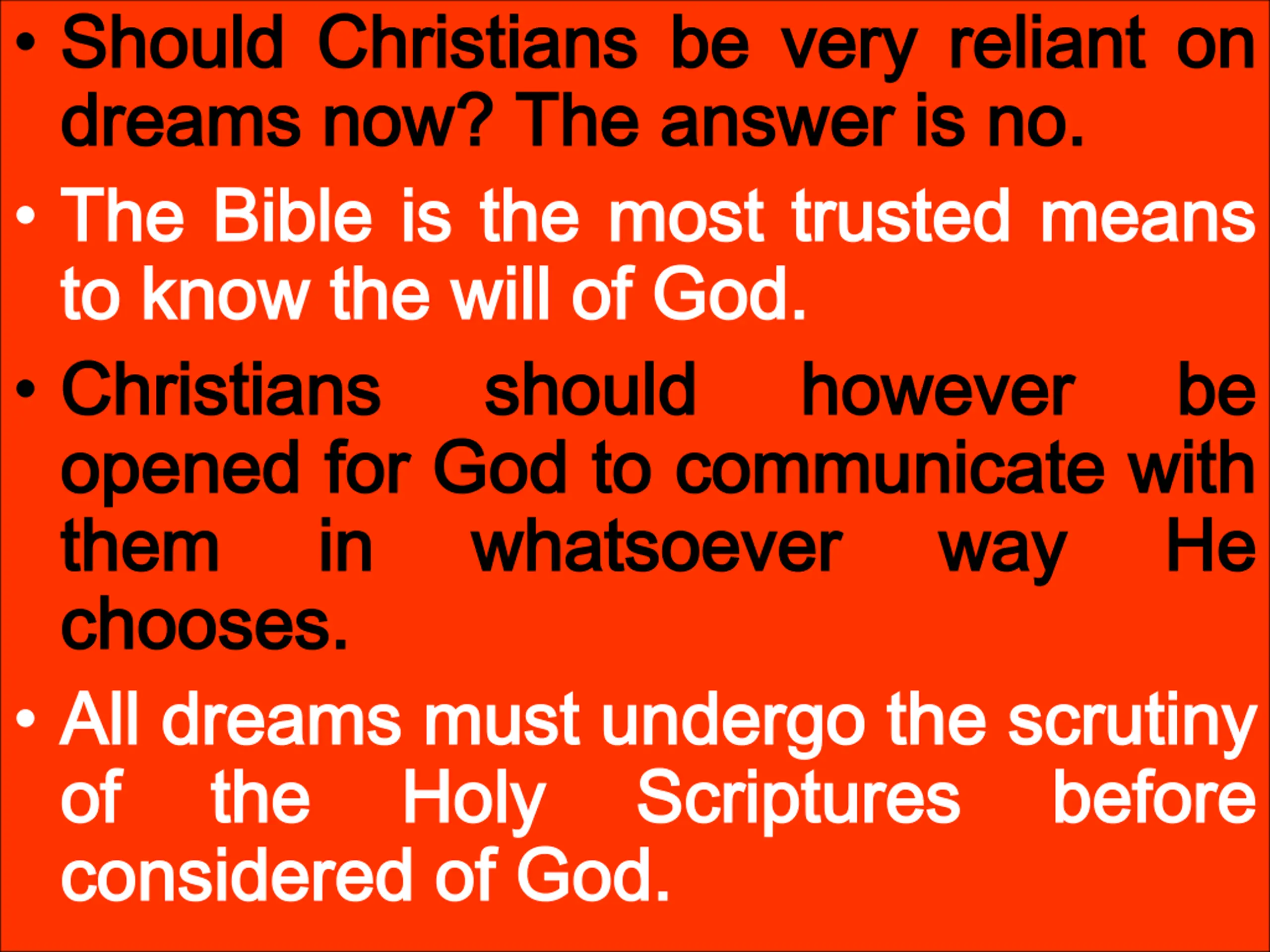 Should Should Christians Christians be dreams dreams now? now? The The The Bible Bible is is the to to know know the the will Christians Christians opened opened for for God them them in in chooses chooses. . All All dreams dreams must of of the the considered considered of of God be very very reliant The answer answer is is no the most most trusted trusted means will of of God God. . should should however however God to to communicate communicate with whatsoever whatsoever reliant on no. . means on be be with He He way way must undergo undergo the Holy Holy Scriptures Scriptures God. . the scrutiny scrutiny before before
