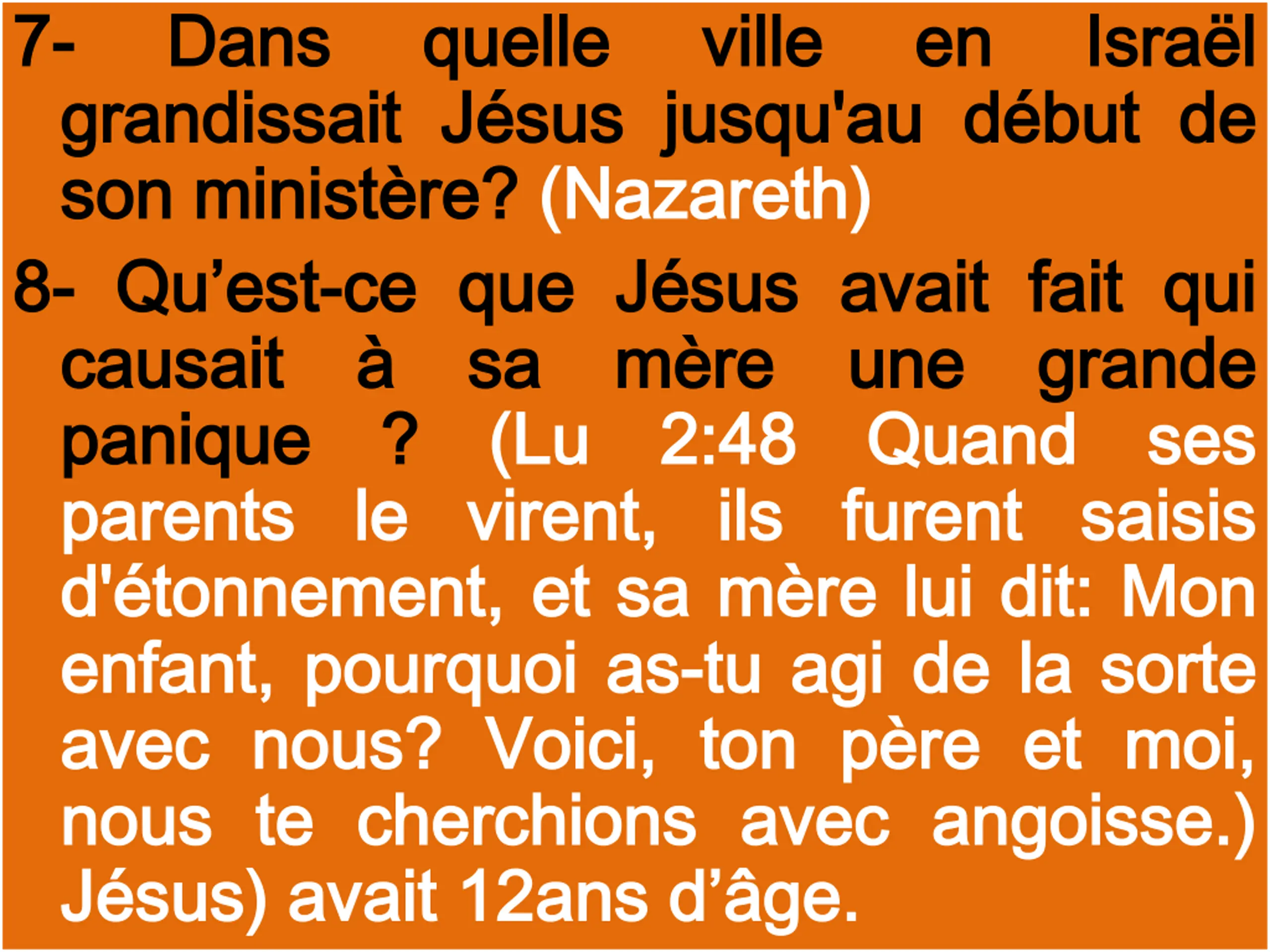 7 7- - quelle quelle J sus jusqu'au jusqu'au d but minist re? (Nazareth) (Nazareth) 8 8- - Qu est Qu est- -ce ce que que J sus causait causait sa sa panique panique ? ? (Lu (Lu parents parents le le virent, virent, ils d' tonnement, d' tonnement, et et sa enfant, enfant, pourquoi pourquoi as avec avec nous? nous? Voici, Voici, ton nous nous te te cherchions cherchions avec J sus) J sus) avait avait 12 12ans ans d ge Dans Dans ville ville en en Isra l Isra l grandissait grandissait J sus son son minist re? d but de de J sus avait m re m re 2 2: :48 48 ils furent sa m re m re lui as- -tu tu agi agi de ton p re avec angoisse d ge. . avait fait une une Quand Quand furent saisis lui dit dit: : Mon de la la sorte p re et et moi, angoisse. .) ) fait qui grande grande qui ses ses saisis Mon sorte moi,