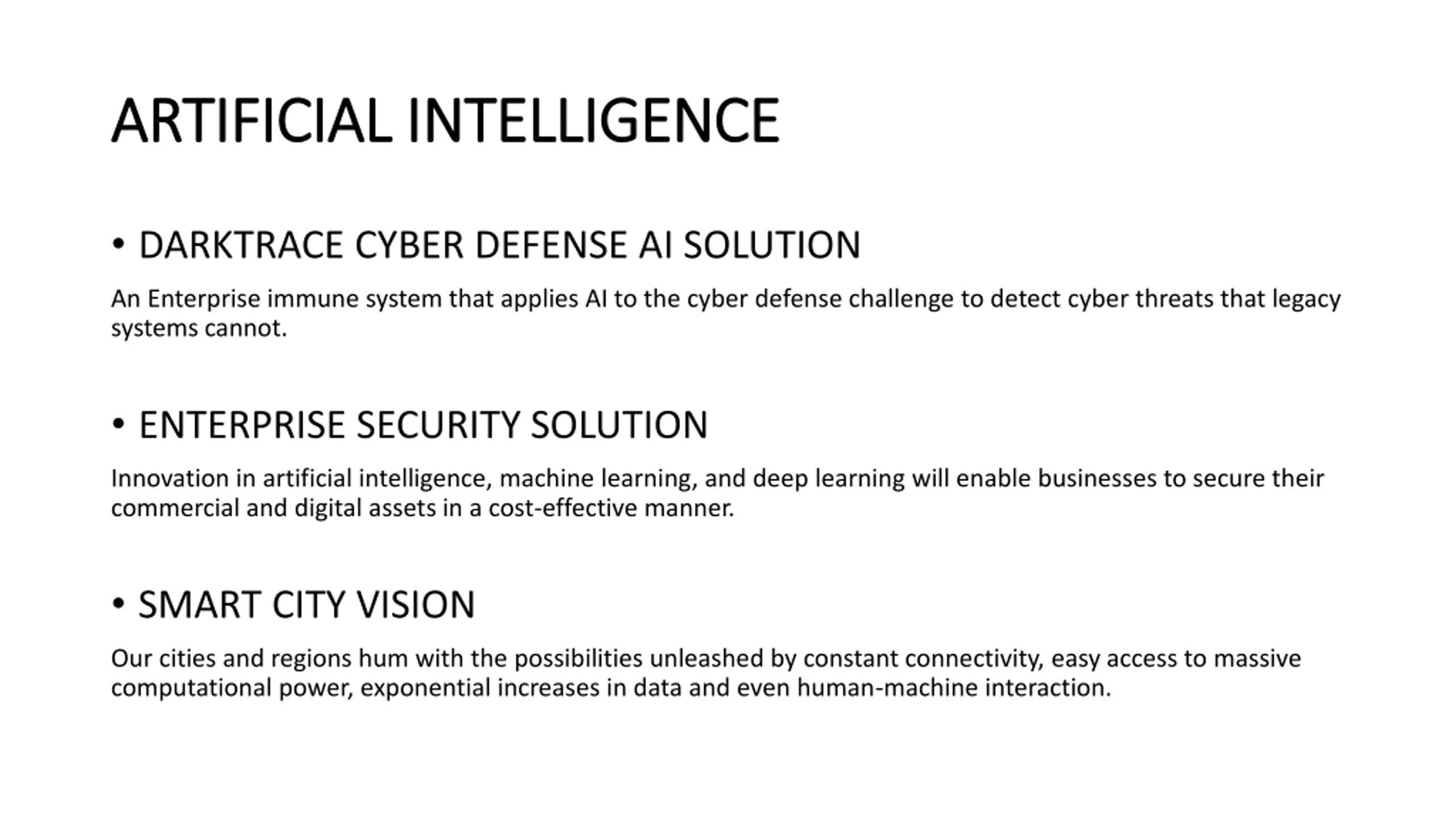 ARTIFICIAL INTELLIGENCE ARTIFICIAL INTELLIGENCE DARKTRACE CYBER DEFENSE AI SOLUTION An Enterprise immune system that applies AI to the cyber defense challenge to detect cyber threats that legacy systems cannot. ENTERPRISE SECURITY SOLUTION Innovation in artificial intelligence, machine learning, and deep learning will enable businesses to secure their commercial and digital assets in a cost-effective manner. SMART CITY VISION Our cities and regions hum with the possibilities unleashed by constant connectivity, easy access to massive computational power, exponential increases in data and even human-machine interaction.