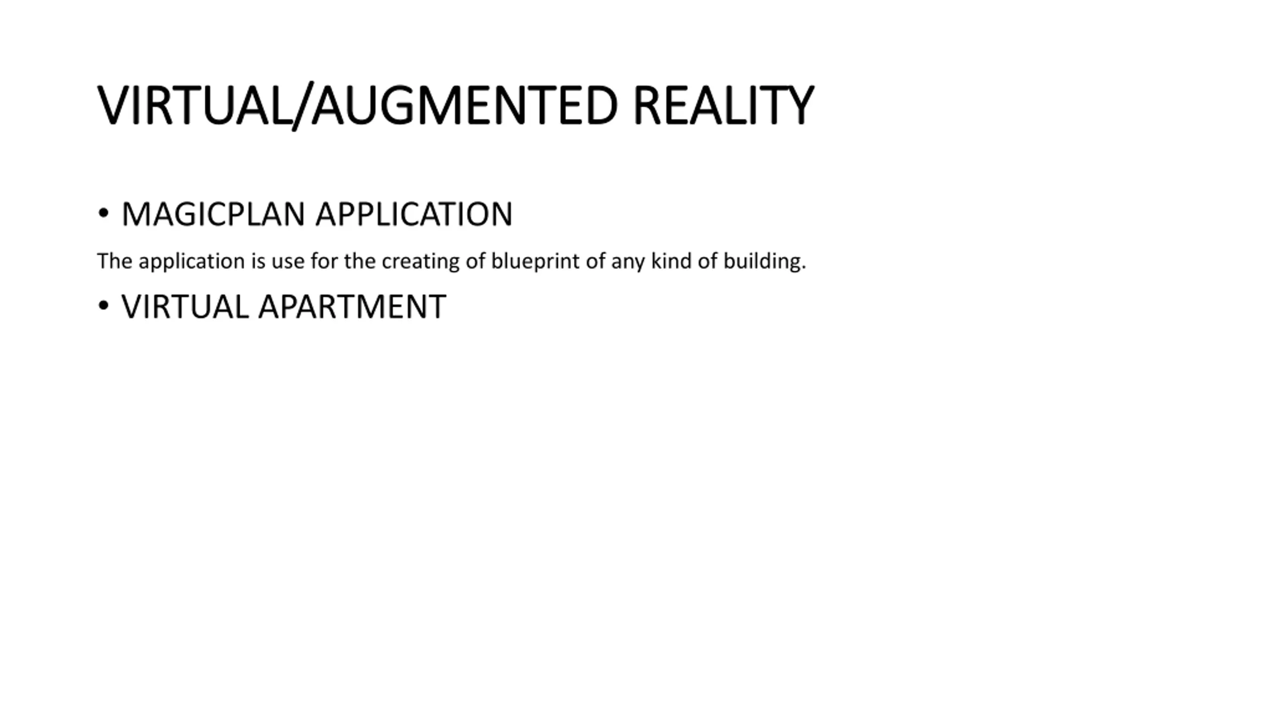 VIRTUAL/AUGMENTED REALITY VIRTUAL/AUGMENTED REALITY MAGICPLAN APPLICATION The application is use for the creating of blueprint of any kind of building. VIRTUAL APARTMENT