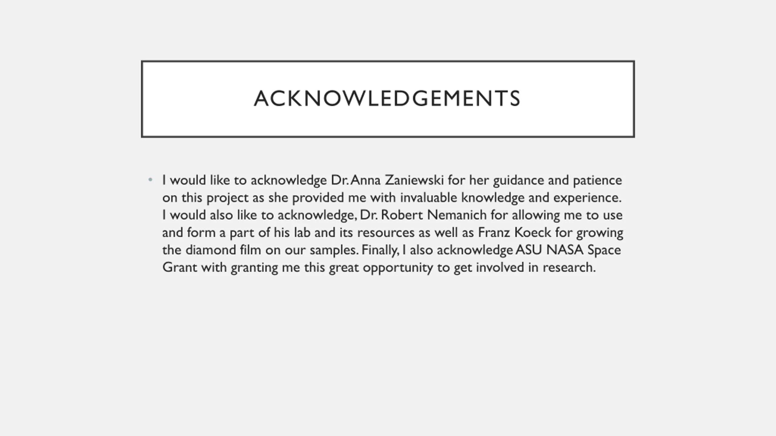 ACKNOWLEDGEMENTS I would like to acknowledge Dr. Anna Zaniewski for her guidance and patience on this project as she provided me with invaluable knowledge and experience. I would also like to acknowledge, Dr. Robert Nemanich for allowing me to use and form a part of his lab and its resources as well as Franz Koeck for growing the diamond film on our samples. Finally, I also acknowledge ASU NASA Space Grant with granting me this great opportunity to get involved in research.