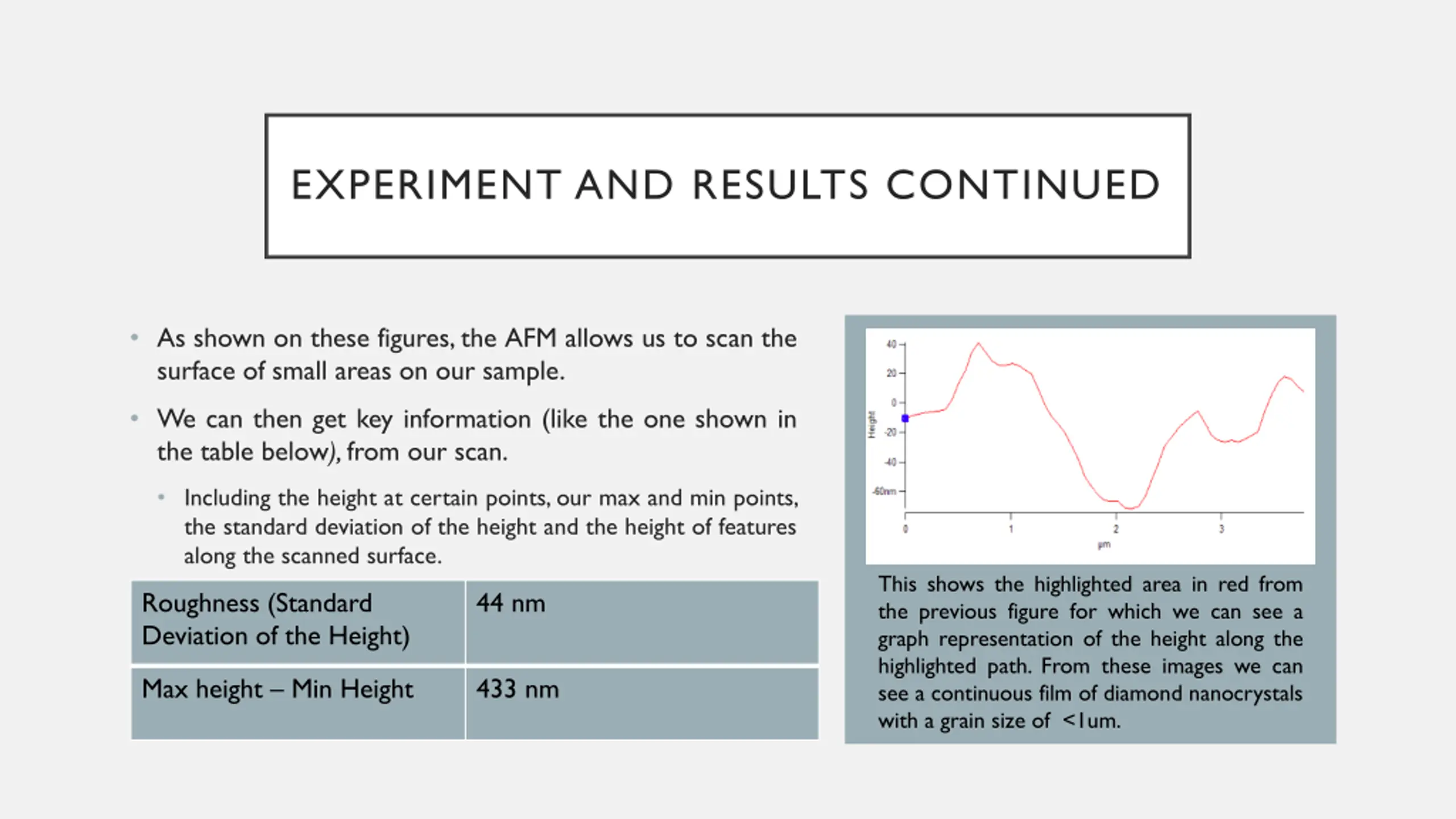 EXPERIMENT AND RESULTS CONTINUED As shown on these figures, the AFM allows us to scan the surface of small areas on our sample. We can then get key information (like the one shown in the table below), from our scan. Including the height at certain points, our max and min points, the standard deviation of the height and the height of features along the scanned surface. This shows the highlighted area in red from the previous figure for which we can see a graph representation of the height along the highlighted path. From these images we can see a continuous film of diamond nanocrystals with a grain size of <1um. Roughness (Standard Deviation of the Height) 44 nm Max height Min Height 433 nm