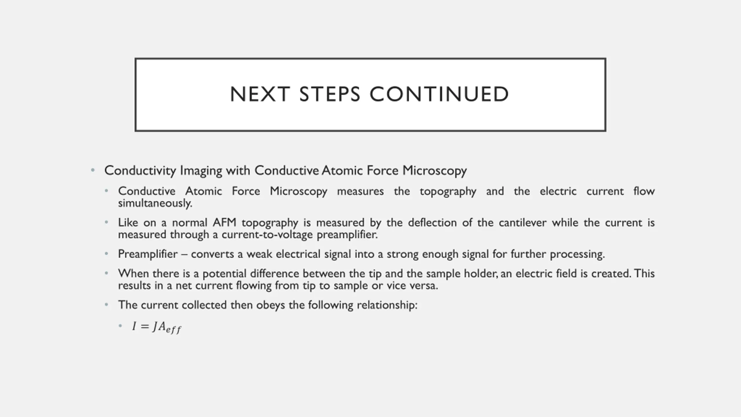 NEXT STEPS CONTINUED Conductivity Imaging with Conductive Atomic Force Microscopy Conductive Atomic Force Microscopy measures the topography and the electric current flow simultaneously. Like on a normal AFM topography is measured by the deflection of the cantilever while the current is measured through a current-to-voltage preamplifier. Preamplifier converts a weak electrical signal into a strong enough signal for further processing. When there is a potential difference between the tip and the sample holder, an electric field is created. This results in a net current flowing from tip to sample or vice versa. The current collected then obeys the following relationship: ? = ?????