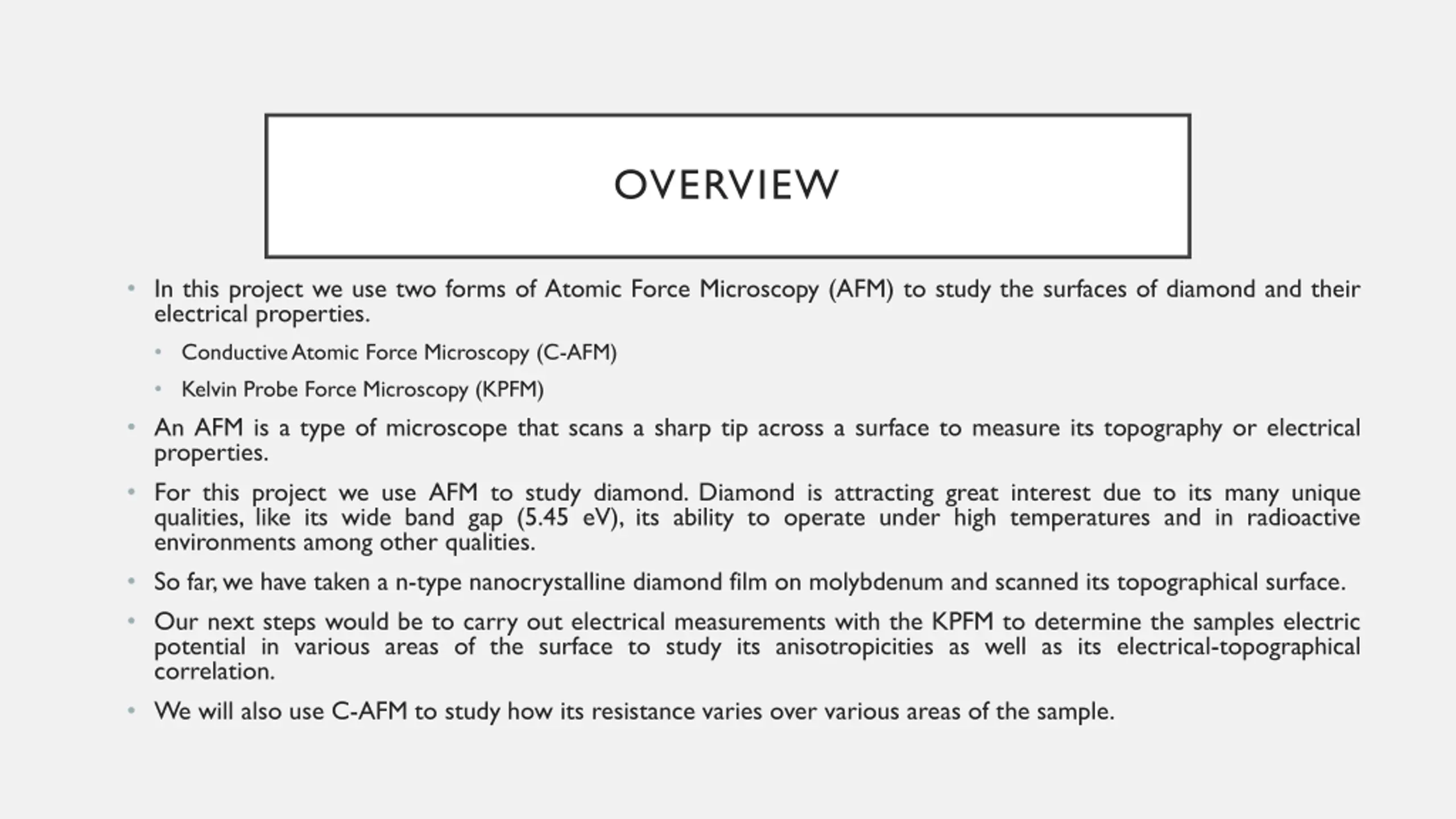 OVERVIEW In this project we use two forms of Atomic Force Microscopy (AFM) to study the surfaces of diamond and their electrical properties. ConductiveAtomic Force Microscopy (C-AFM) Kelvin Probe Force Microscopy (KPFM) An AFM is a type of microscope that scans a sharp tip across a surface to measure its topography or electrical properties. For this project we use AFM to study diamond. Diamond is attracting great interest due to its many unique qualities, like its wide band gap (5.45 eV), its ability to operate under high temperatures and in radioactive environments among other qualities. So far,we have taken a n-type nanocrystalline diamond film on molybdenum and scanned its topographical surface. Our next steps would be to carry out electrical measurements with the KPFM to determine the samples electric potential in various areas of the surface to study its anisotropicities as well as its electrical-topographical correlation. We will also use C-AFM to study how its resistance varies over various areas of the sample.
