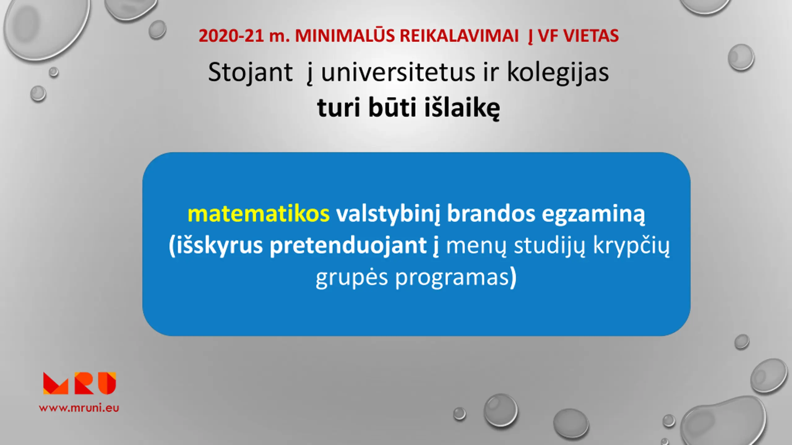 2020-21 m. MINIMALS REIKALAVIMAI VF VIETAS Stojant universitetus ir kolegijas turi b ti i laik matematikos valstybin brandos egzamin (i skyrus pretenduojant men studij kryp i grup s programas) www.mruni.eu